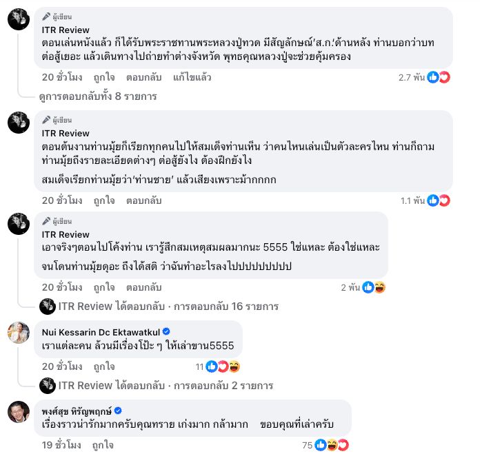 รวมถึงข้อความ “ตอนต้นงานท่านมุ้ยก็เรียกทุกคนไปให้สมเด็จท่านเห็น ว่าคนไหนเล่นเป็นตัวละครไหน ท่านก็ถามท่านมุ้ยถึงรายละเอียดต่างๆ ต่อสู้ยังไง ต้องฝึกยังไง สมเด็จเรียกท่านมุ้ยว่า ‘ท่านชาย’ แล้วเสียงเพราะม้ากกกก”