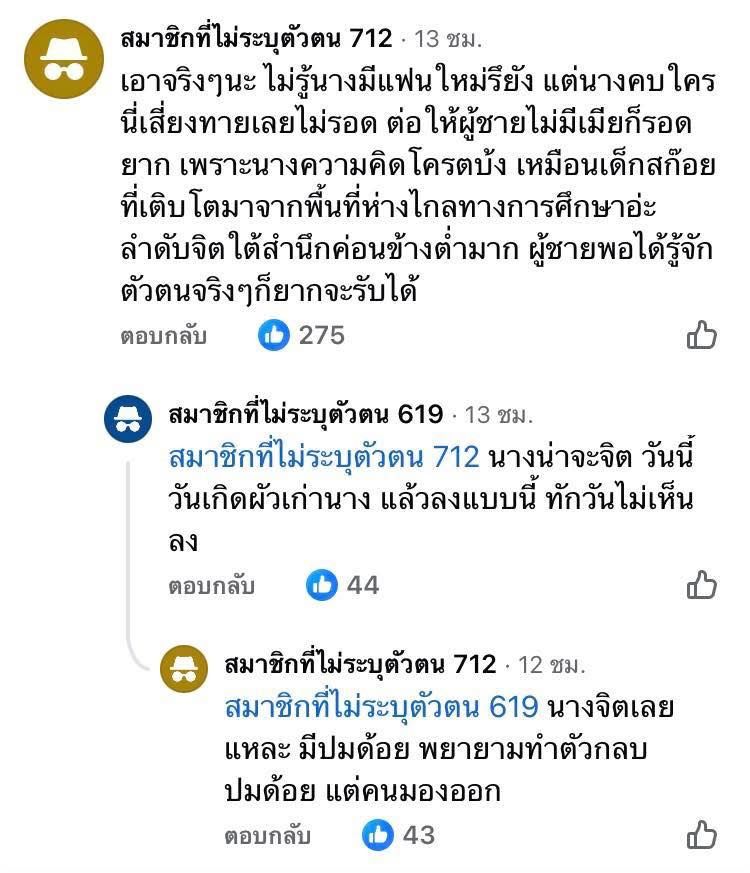 ซึ่งล่าสุด แบม ได้แคปคอมเมนต์ที่มีชาวเน็ตมาเมาท์ถึงแบมในโซเชียล ได้เขียนข้อความถึง แบม ในทำนองว่า ไม่รู้นางมีแฟนใหม่รึยัง แต่คบกับใครก็ไปไม่รอด เพราะความคิดไม่ดี เหมือนเด็กที่เติบโตมาจากพื้นที่ห่างไกลทางการศึกษา ลำดับจิตใต้สำนึกค่อนข้างต่ำมาก พอผู้ชายได้รู้จักตัวตนจริงๆ ก็ยากจะรับได้ และยังบอกอีกว่า แบมเป็นโรคจิต พยายามกลบปมด้อยของตัวเอง แต่คนมองออก