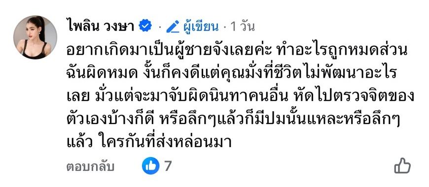 ส่วนจะว่าเราจิต ถ้าไปตรวจแล้วไม่จิต จะตบปากให้นะคะ ถือว่าแลกกัน ไม่มีปมด้อยหรอก แต่ทุกวันนี้พัฒนาตัวเองให้ดีขึ้นทุกๆ วัน ชีวิตก็มีความสุขมากแล้ว ส่วนเธอจะทุกข์กับฉันก็ไปจัดการตัวเองเอานะ สุดท้ายนี้ ผู้ชายมีเป็นร้อยเป็นล้าน"