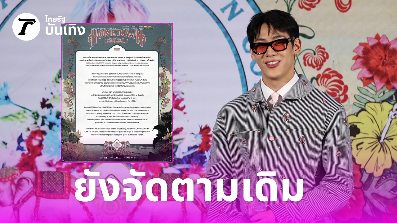 “สำหรับ คอนเสิร์ต “2025 BamBam HOMETOWN Concert in Bangkok” ยังคงจัดตามกำหนดเดิมที่ได้ดำเนินการเตรียมงานไว้ทั้งสองรอบการแสดงในวันเสาร์ และอาทิตย์ที่ 22-23 พฤศจิกายน 2568 โดยจะปรับรูปแบบงานให้เหมาะสมกับบรรยากาศแห่งการไว้อาลัย