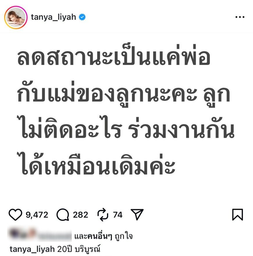 กลายเป็นดราม่าร้อน หลังจากที่ ธัญญ่า ธัญญาเรศ ประกาศลดสถานะกับ เป๊ก สัณณ์ชัย เองตระกูล สามีนักธุรกิจ โดยโพสต์ภาพข้อความ “ลดสถานะเป็นแค่พ่อกับแม่ของลูกนะคะ ลูกไม่ติดอะไร ร่วมงานกันได้เหมือนเดิมค่ะ” พร้อมทั้งเขียนแคปชั่นสั้นๆ ว่า “20 ปีบริบูรณ์” จนทำให้หลายคนสงสัยว่าสาเหตุที่ทำให้ธัญญ่าตัดสินใจลดสถานะเป๊กเป็นเรื่องเกี่ยวกับมือที่ 3 หรือไม่