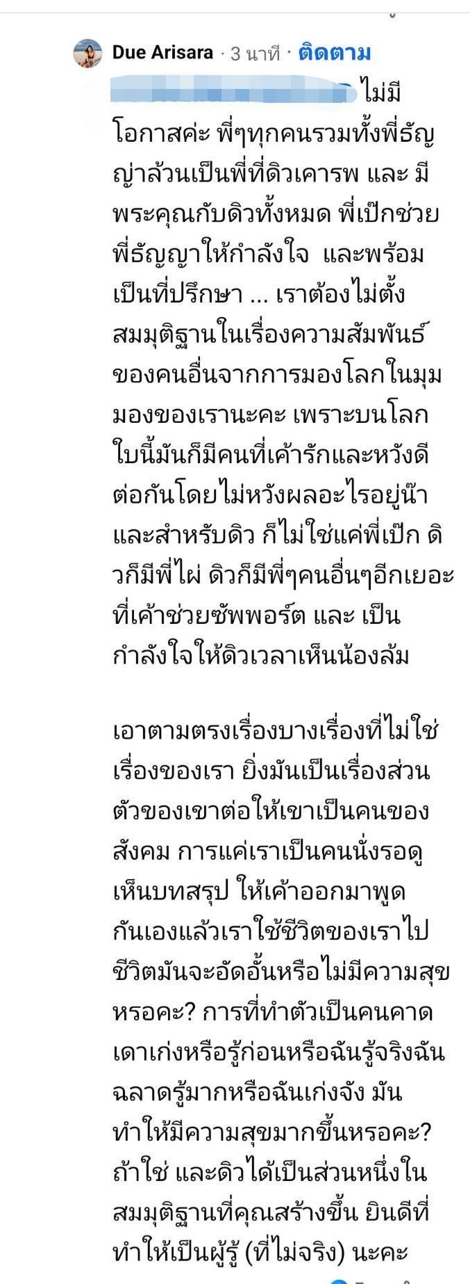 และสําหรับดิว ก็ไม่ใช่แค่พี่เป๊ก ดิวก็มีพี่ไผ่ ดิวก็มีพี่ๆ คนอื่นๆ อีกเยอะ ที่เค้าช่วยซัพพอร์ต และเป็นกําลังใจให้ดิวเวลาเห็นน้องล้ม เอาตามตรงเรื่องบางเรื่องที่ไม่ใช่เรื่องของเรา ยิ่งมันเป็นเรื่องส่วนตัวของเขาต่อให้เขาเป็นคนของสังคม การแค่เราเป็นคนนั่งรอดูเห็นบทสรุป ให้เค้าออกมาพูด กันเองแล้วเราใช้ชีวิตของเราไป ชีวิตมันจะอัดอั้นหรือไม่มีความสุขหรอคะ?
