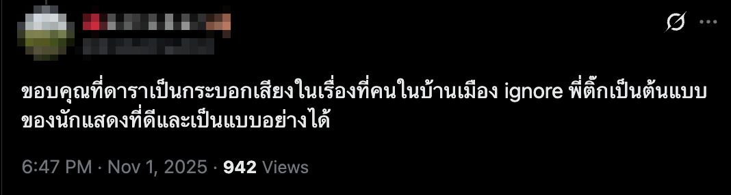 ขอบคุณที่ดาราเป็นกระบอกเสียงในเรื่องที่คนในบ้านเมือง ignore พี่ติ๊กเป็นต้นแบบของนักแสดงที่ดีและเป็นแบบอย่างได้"