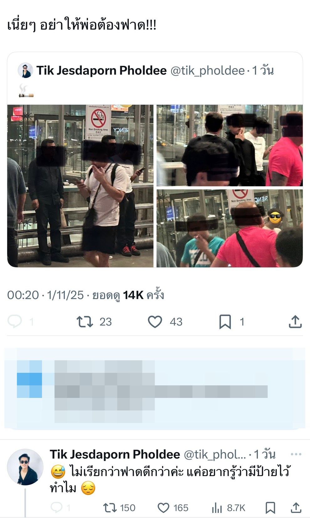 งานนี้ก็มีชาวเน็ตเข้ามาแชร์รูปที่ติ๊กโพสต์ลงพร้อมเขียนแคปชันว่า "เนี่ยๆ อย่าให้พ่อต้องฟาด!!!" งานนี้ ติ๊กได้เข้ามาคอมเมนต์เอาไว้ว่า "ไม่เรียกว่าฟาดดีกว่าค่ะ แค่อยากรู้ว่ามีป้ายไว้ทำไม"