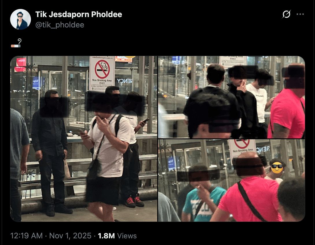 ทำเอาพระเอกหนุ่มหล่ออย่าง ติ๊ก เจษฎาภรณ์ ผลดี เห็นแล้วถึงกับสงสัย จนต้องถ่ายรูปและโพสต์ลงในโซเชียล กับพฤติกรรมของคนที่สูบบุหรี่ที่สนามบินแม้จะมีป้ายห้ามสูบติดอยู่ในบริเวณนั้น โดยเจ้าตัวได้โพสต์รูปดังกล่าว พร้อมลงอีโมจิรูปบุหรี่