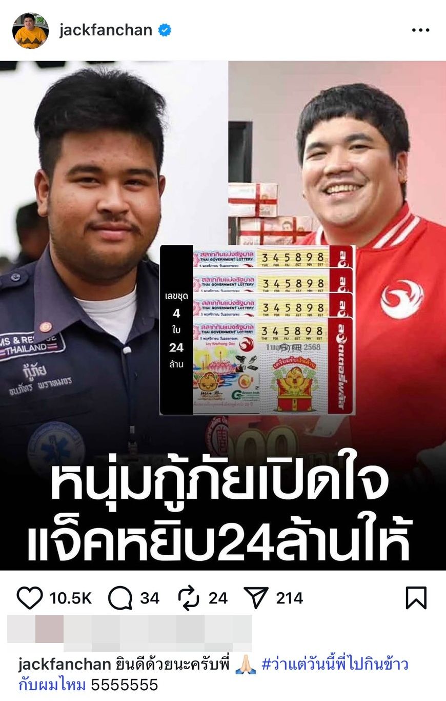 ล่าสุด แจ็ค แฟนฉัน ก็ได้โพสต์ภาพของพี่กู้ภัยที่ถูกลอตเตอรี่รางวัลที่ 1 จำนวน 4 ใบ รับเงินรางวัล 24 ล้านบาท และเขียนแคปชั่นว่า "ยินดีด้วยนะครับพี่ #ว่าแต่วันนี้พี่ไปกินข้าวกับผมไหม 5555555"