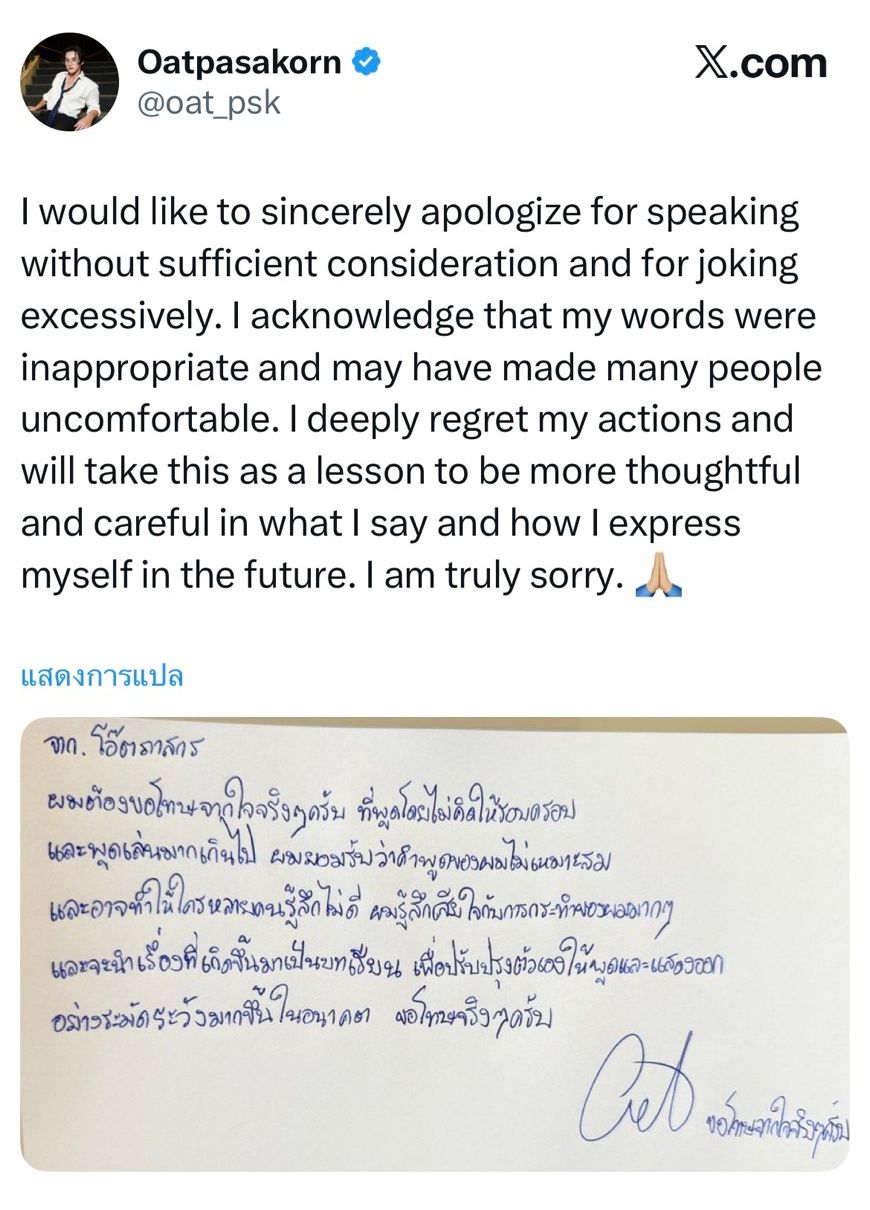 - ล่าสุด โอ๊ต ก็ได้ออกมาโพสต์ข้อความด้วยการเขียนลายมือของตัวเอง เพื่อขอโทษที่ใช้คำพูดไม่เหมาะสมและจะเป็นบทเรียนที่สำคัญของชีวิต