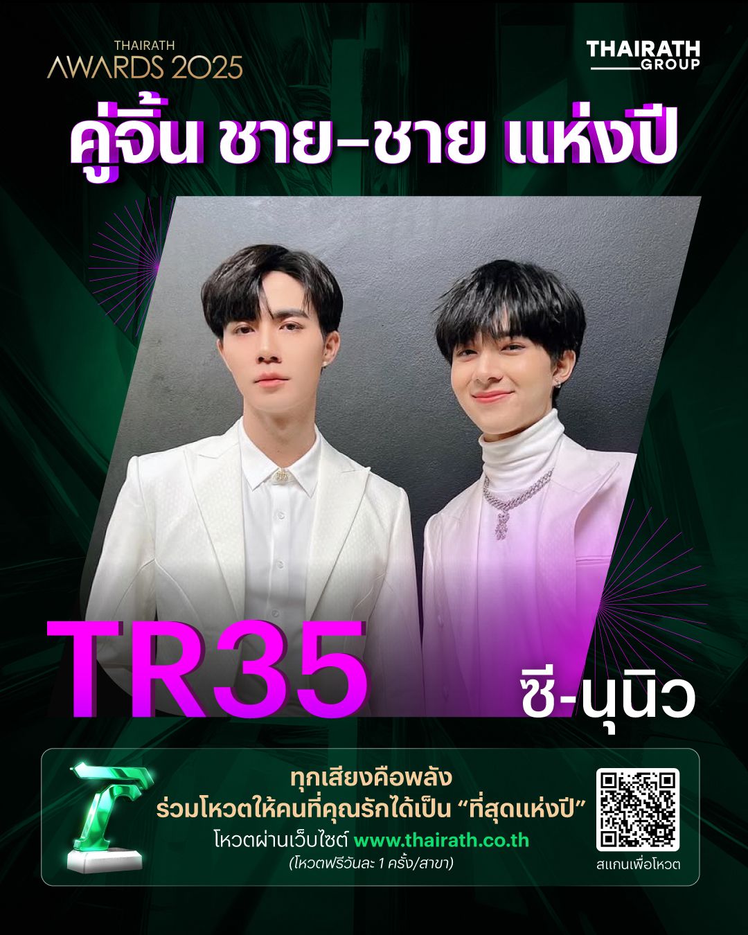 ผู้ที่สร้างผลงานโดดเด่นจนกลายเป็นปรากฏการณ์ไปทั่ววงการบันเทิง เพื่อค้นหา "คู่จิ้นชาย-ชาย ที่สุดแห่งปี" ชิงรางวัล " ไทยรัฐที่สุดแห่งปี 2025"