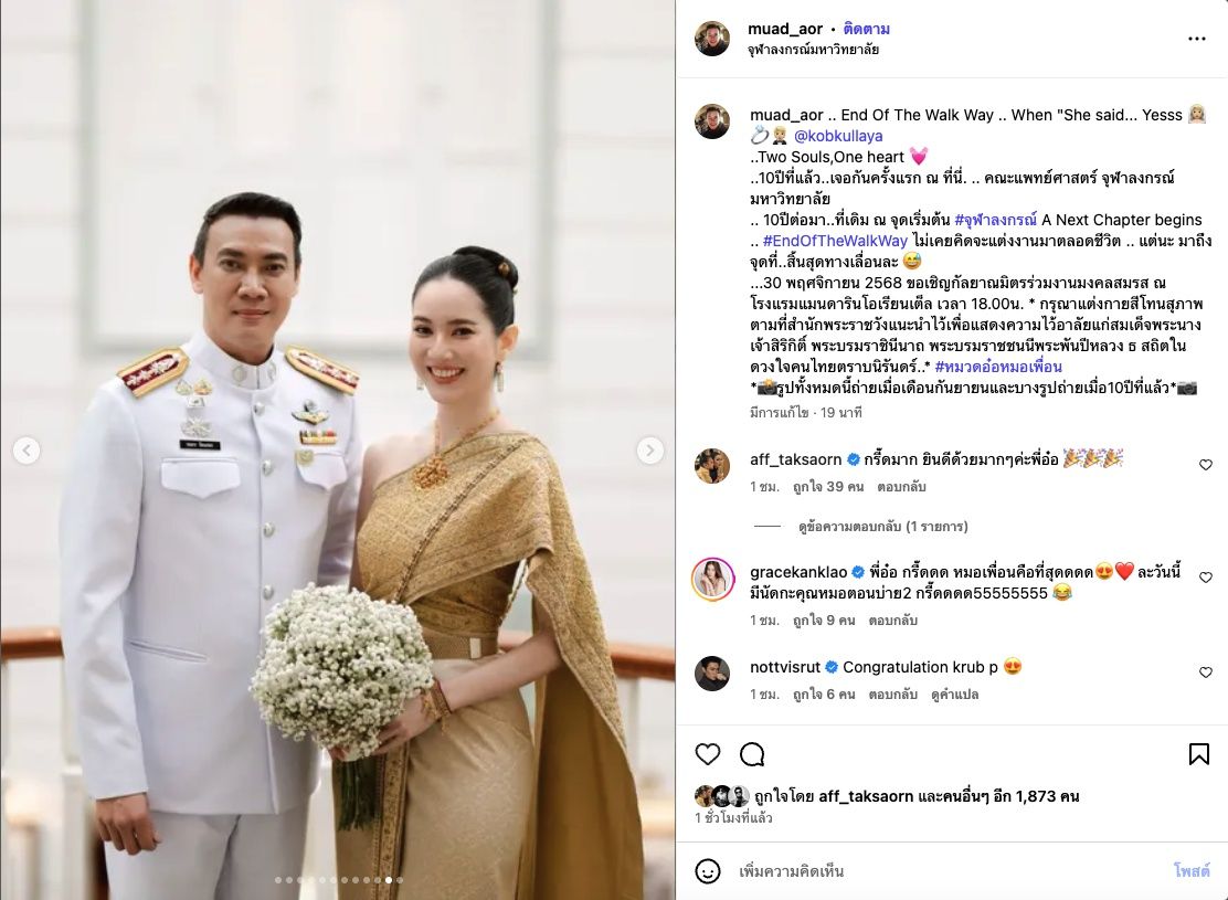 ซึ่งในเฟซบุ๊กของหมวดอ๋อได้โพสต์ภาพพรีเวดดิ้งสุดหวาน และเขียนข้อความว่า “.. End Of The Walk Way .. When "She said... Yesss Kobkullaya Chuengprasertsri