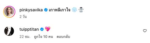 ในขณะที่ไอจี @pinkysavika ของพิ้งกี้ก็โพสต์ภาพกลางหิมะที่ใช้ AI ตกแต่งเช่นกัน มาพร้อมแคปชั่น “เกาหลีเกาใจ” และใส่อีโมจิหิมะและตุ๊กตาหิมะ ก่อนที่ตุ้ยจะเข้ามาคอมเมนต์เป็นอีโมจิหัวใจสีชมพูเช่นกัน
