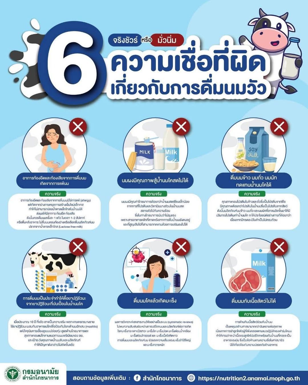 -นอกจากนี้กรมอนามัยก็ได้ออกมาให้ข้อมูลเพิ่มเติมเกี่ยวกับความเชื่อผิดๆ เรื่องการดื่มนมวัวด้วย เช่น อาการท้องอืดและท้องเสียจากการดื่มนมเกิดจากการแพ้นม, นมผงมีคุณภาพสู้น้ำนมโคสดไม่ได้, ดื่มนมข้าวนมถั่ว นมนัททดแทนนมโคได้, การดื่มนมเป็นประจำทำให้ดื้อยาปฏิชีวนะจากยาปฏิชีวนะที่ปนเปื้อนในน้ำนมโค, ดื่มนมโคแล้วเกิดมะเร็ง, ดื่มนมกับเนื้อสัตว์ไม่ได้