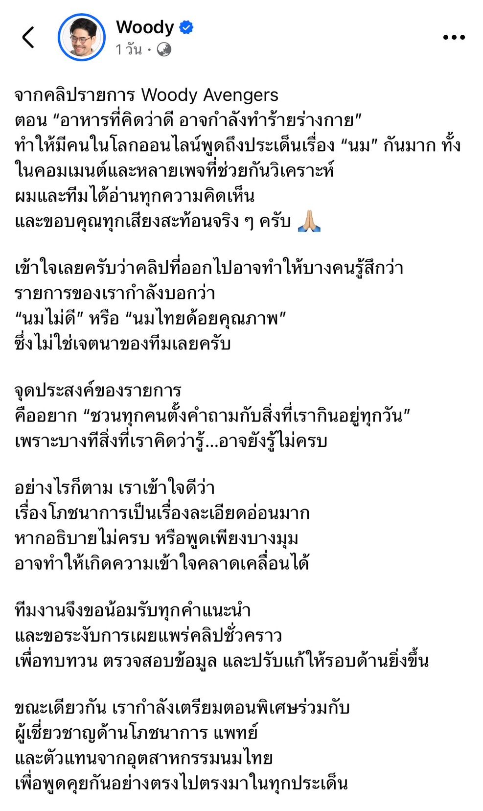 - หลังจากที่มีดราม่าร้อนแรง วู้ดดี้ ออกมาโพสต์ข้อความชี้แจง โดยยืนยันว่าไม่ได้มีเจตนาที่จะบอกว่านมไม่ดี หรือนมไทยไม่ได้คุณภาพ จุดประสงค์รายการคืออยากชวนทุกคนตั้งคำถามกับสิ่งที่กินอยู่ทุกวัน เพราะบางสิ่งที่รู้อาจยังรู้ไม่ครบ เข้าใจว่าข้อมูลโภชนาการเป็นเรื่องละเอียดอ่อน ถ้าอธิบายไม่ครบ หรือพูดบางมุม อาจทำให้คนเข้าใจผิดได้