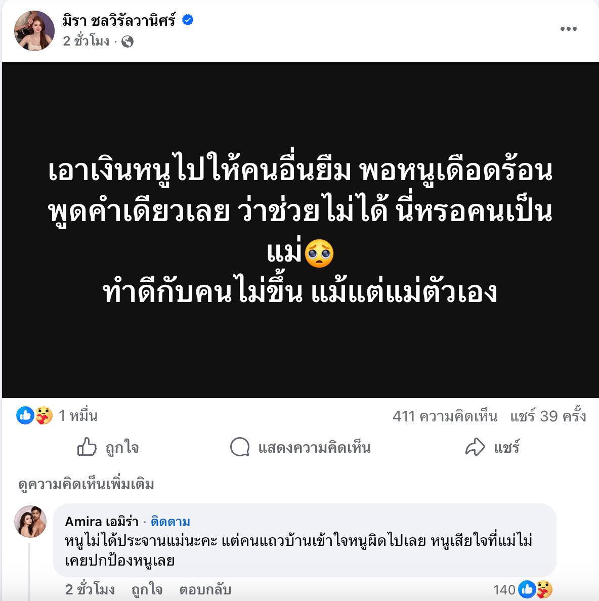ก่อนที่เอ๋จะโพสต์ข้อความต่ออีกว่า "เอาเงินหนูไปให้คนอื่นยืม พอหนูเดือดร้อน พูดคำเดียวเลย ว่าช่วยไม่ได้ นี่หรอคนเป็นแม่ ทำดีกับคนไม่ขึ้น แม้แต่แม่ตัวเอง"