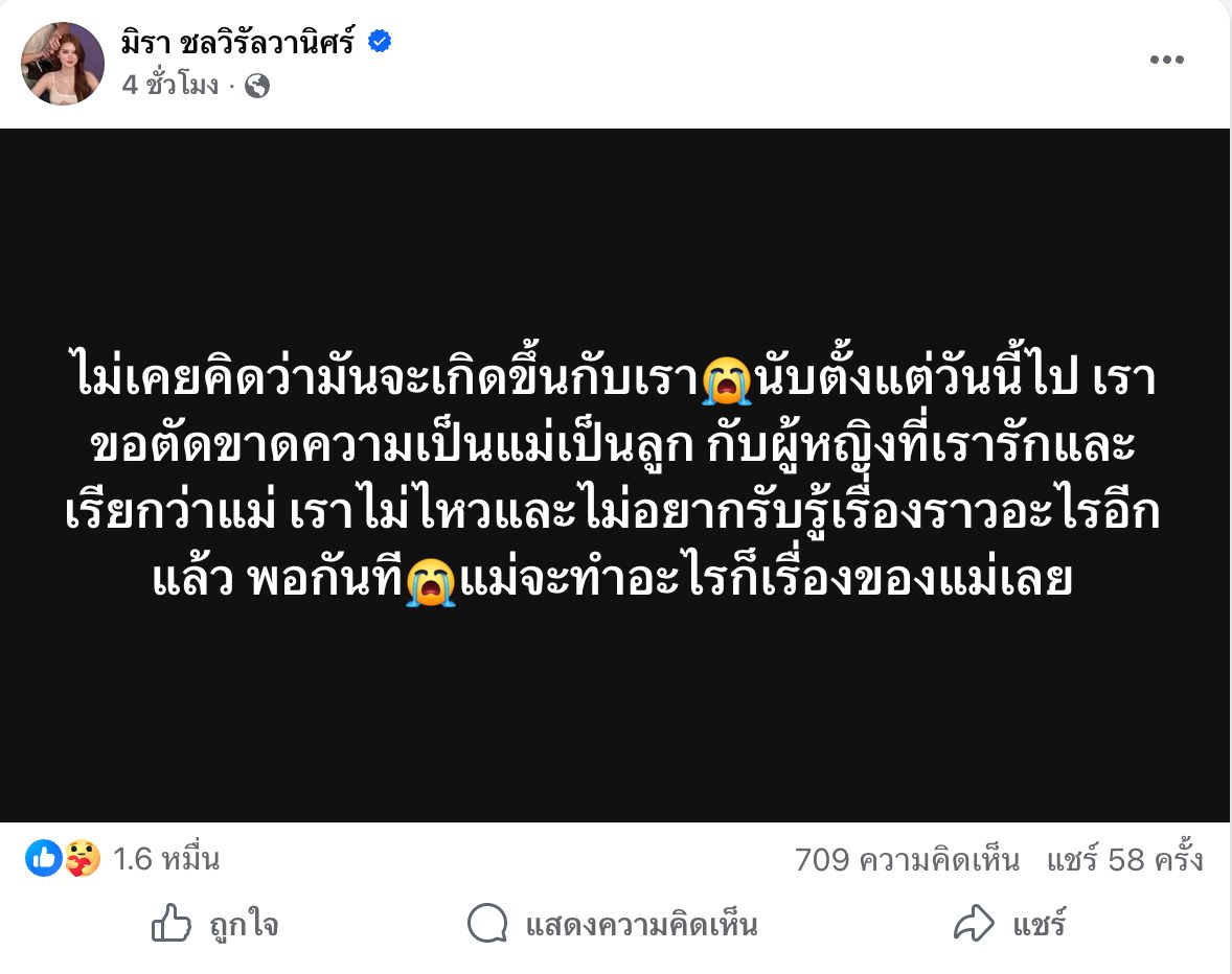 ทำเอาชาวเน็ตคอมเมนต์อย่างมากมาย เมื่อ เอ๋ มิรา ได่โพสต์ข้อความผ่านทางเฟซบุ๊กของตัวเอง ประกาศตัดขาดความเป็นแม่ลูกกับแม่ของตัวเอง พร้อมเผยเหตุผลที่ต้องทำแบบนี้เอาไว้ว่า