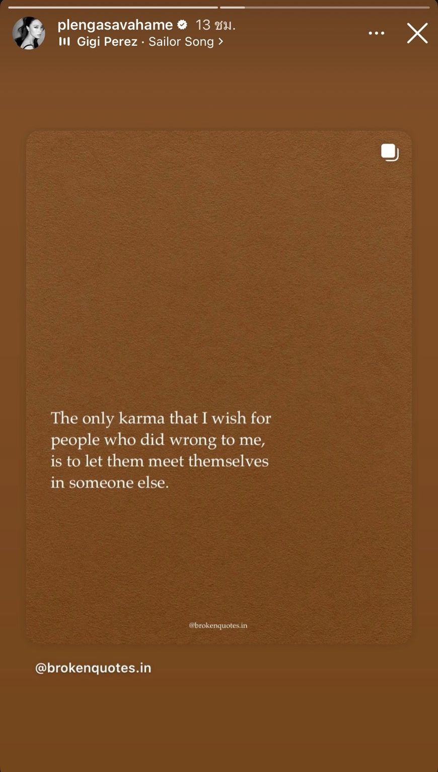 ล่าสุด เพลง ชนม์ทิดา ได้โพสต์ไอจีสตอรี่เป็นภาพข้อความคำคมจากไอจี @brokenquotes.in ที่เขียนข้อความว่า “The only karma that I wish for people who did wrong to me, is to let them meet themselves in someone else”