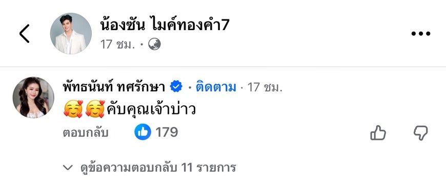 ในขณะที่เพจ น้องซัน ไมค์ทองคำ7 ก็ได้โพสต์ภาพในร้านเช่าชุดแต่งงานเช่นกัน พร้อมทั้งเขียนข้อความว่า “เริ่มแล้วเจ้าสาวผม ต่อไปชุดเจ้าบ่าว” ก่อนจะโพสต์ภาพกับเจ้าสาว พร้อมทั้งเขียนข้อความ “เห็นรอยยิ้มของเจ้าสาวในวันนี้แล้ว…หัวใจผมก็ยิ้มตาม วันนี้คืออีกหนึ่งวันที่พรลิขิตพาเรามาสู่ความสุข เพราะเราได้ลองชุดเจ้าบ่าว–เจ้าสาวด้วยกัน วันสำคัญกำลังใกล้เข้ามาเรื่อยๆ และเมื่อถึงวันนั้น…ผมเชื่อว่าเขาจะยิ้มกว้างที่สุด และมีความสุขในแบบของเรา”