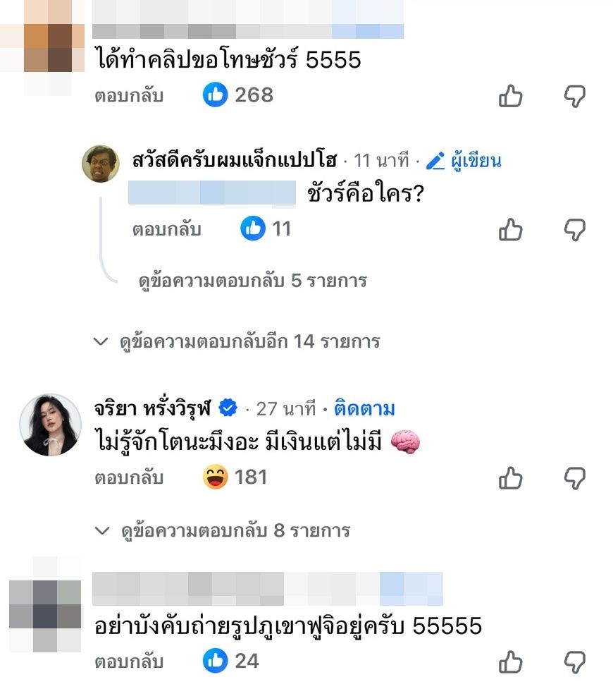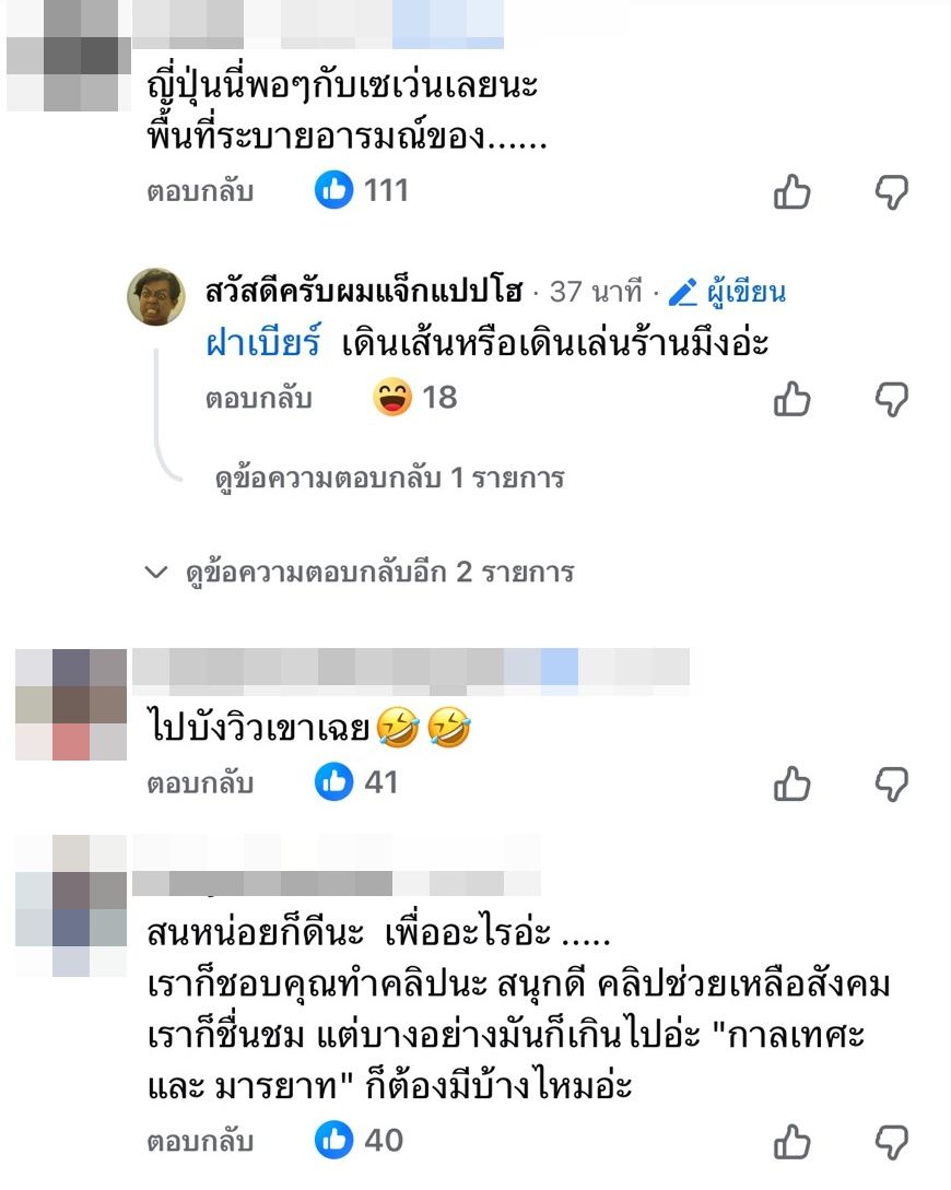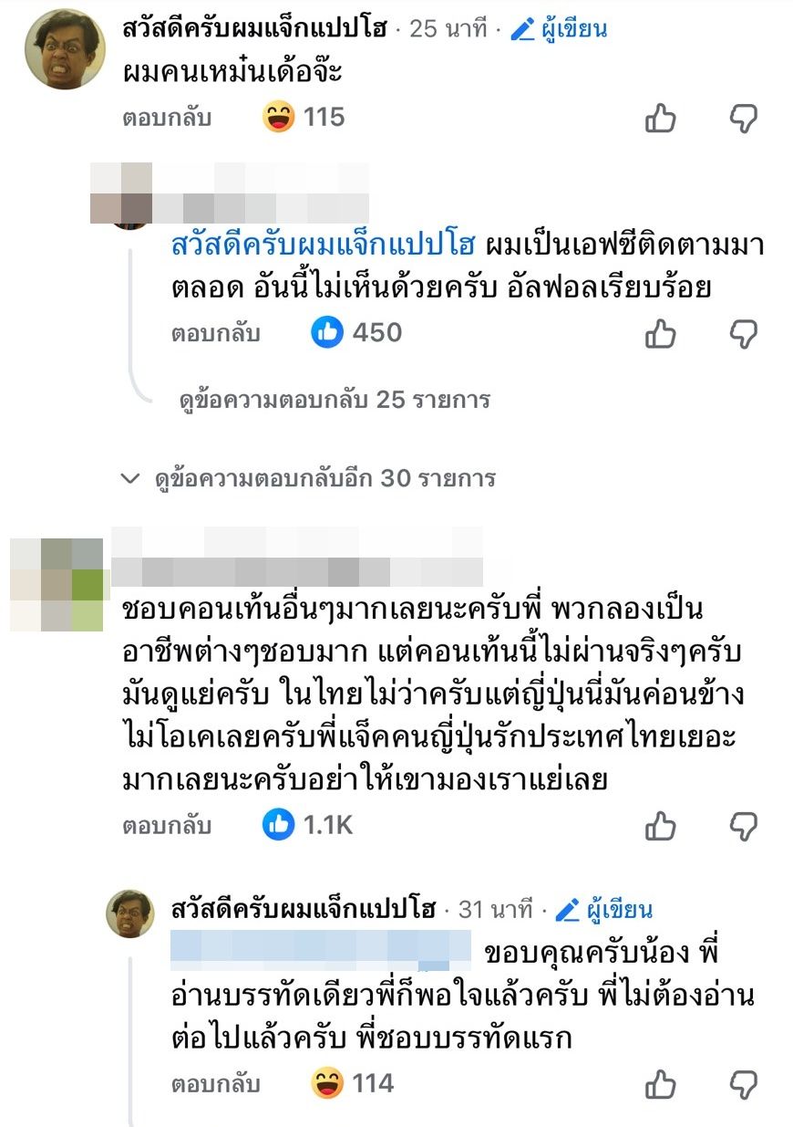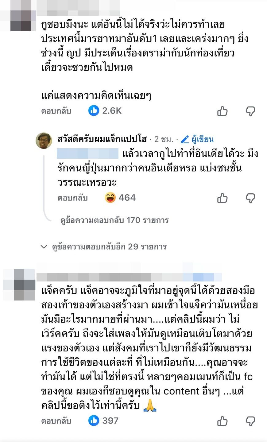 - ชาวเน็ต “ชอบคอนเทนต์อื่นๆมากเลยนะครับพี่ พวกลองเป็นอาชีพต่างๆชอบมาก แต่คอนเทนต์นี้ไม่ผ่านจริงๆครับมันดูแย่ครับ ในไทยไม่ว่าครับแต่ญี่ปุ่นนี่มันค่อนข้างไม่โอเคเลยครับพี่แจ็กคนญี่ปุ่นรักประเทศไทยเยอะมากเลยนะครับอย่าให้เขามองเราแย่เลย”