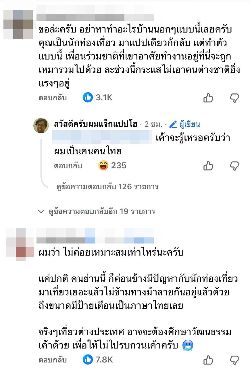 - ชาวเน็ต “ขอล่ะครับ อย่าหาทำอะไรบ้านนอกๆแบบนี้เลยครับ คุณเป็นนักท่องเที่ยว มาแปปเดียวก็กลับ แต่ทำตัวแบบนี้ เพื่อนร่วมชาติที่เขาอาศัยทำงานอยู่ที่นี่จะถูกเหมารวมไปด้วย และช่วงนี้กระแสไม่เอาคนต่างชาติยิ่งแรงๆอยู่”