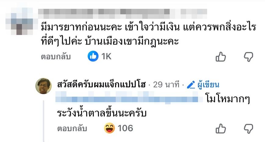 - ชาวเน็ต “มีมารยาทก่อนนะคะ เข้าใจว่ามีเงิน แต่ควรพกสิ่งอะไรที่ดีๆไปค่ะ บ้านเมืองเขามีกฎนะคะ”