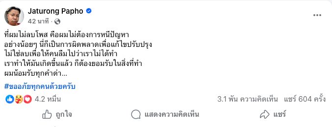 ล่าสุด แจ็กแปปโฮ ก็ได้ออกมาโพสต์ข้อความผ่านเฟซบุ๊ก Jaturong Papho ซึ่งมีข้อความว่า "ที่ผมไม่ลบโพส คือผมไม่ต้องการหนีปัญหา อย่างน้อยๆ นี่ก็เป็นการผิดพลาดเพื่อแก้ไขปรับปรุงไม่ใช่ลบเพื่อให้คนลืมไปว่าเราไม่ได้ทำ เราทำให้มันเกิดขึ้นแล้ว ก็ต้องยอมรับในสิ่งที่ทำ ผมน้อมรับทุกคำด่า…#ขออภัยทุกคนด้วยครับ"