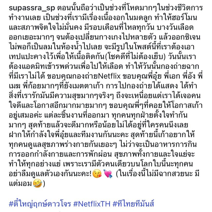 "ตอนนั้นถือว่าเป็นช่วงที่โหดมากๆ ในช่วงชีวิตการทำงานเลย เป็นช่วงที่เรามีเรื่องเนื้องอกในมดลูก ทำให้ฮอร์โมนและสภาพจิตใจไม่มั่นคง มีรอบเดือนที่ไหลทุกวัน บางวันเลือดออกเยอะมากๆ จนต้องเปลี่ยนกางเกงไปหลายตัว แล้วออกซิเจนไม่พอก็เป็นลมในห้องน้ำไปเลย จะมีรูปในโพสต์นี้ที่เราต้องเอาเทปแปะคางไว้เพื่อให้เนื้อติดกัน (โชคดีที่ไม่ต้องเย็บ)