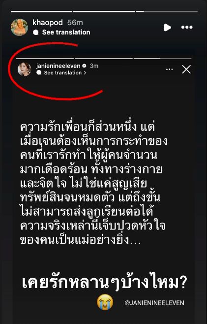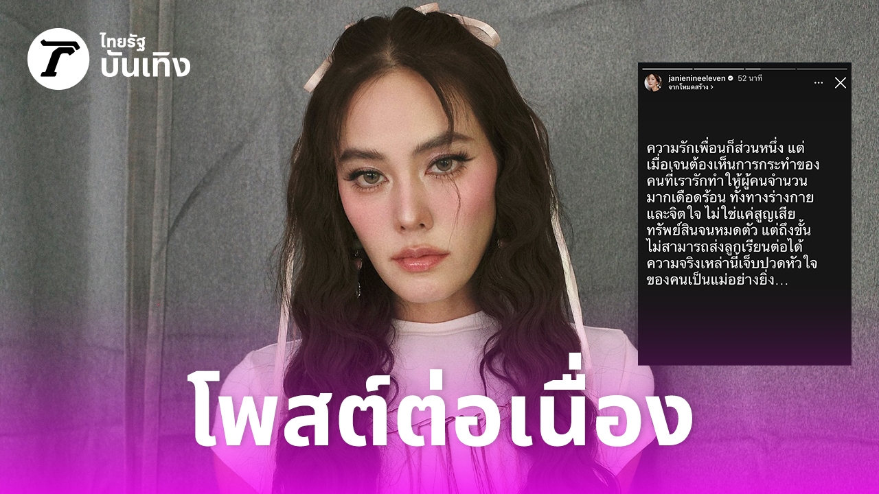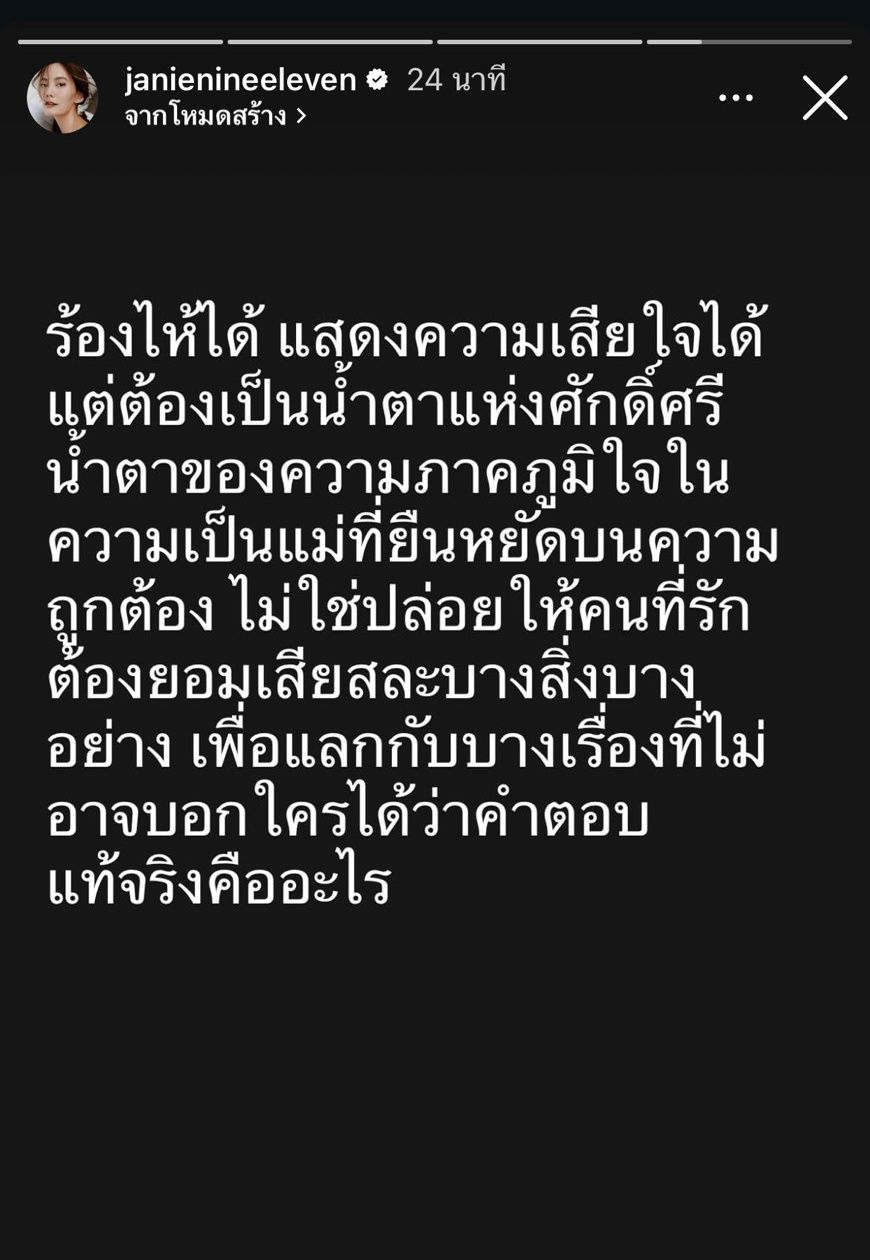 จากนั้น เจนี่ ก็โพสต์ไอจีสตอรี่เพิ่มอีกว่า “ร้องไห้ได้ แสดงความเสียใจได้ แต่ต้องเป็นน้ำตาแห่งศักดิ์ศรี น้ำตาของความภาคภูมิใจในความเป็นแม่ที่ยืนหยัดบนความถูกต้อง ไม่ใช่ปล่อยให้คนที่รักต้องเสียสละบางสิ่งบางอย่าง เพื่อแลกกับบางเรื่องที่ไม่อาจบอกใครได้ว่าคำตอบแท้จริงคืออะไร”