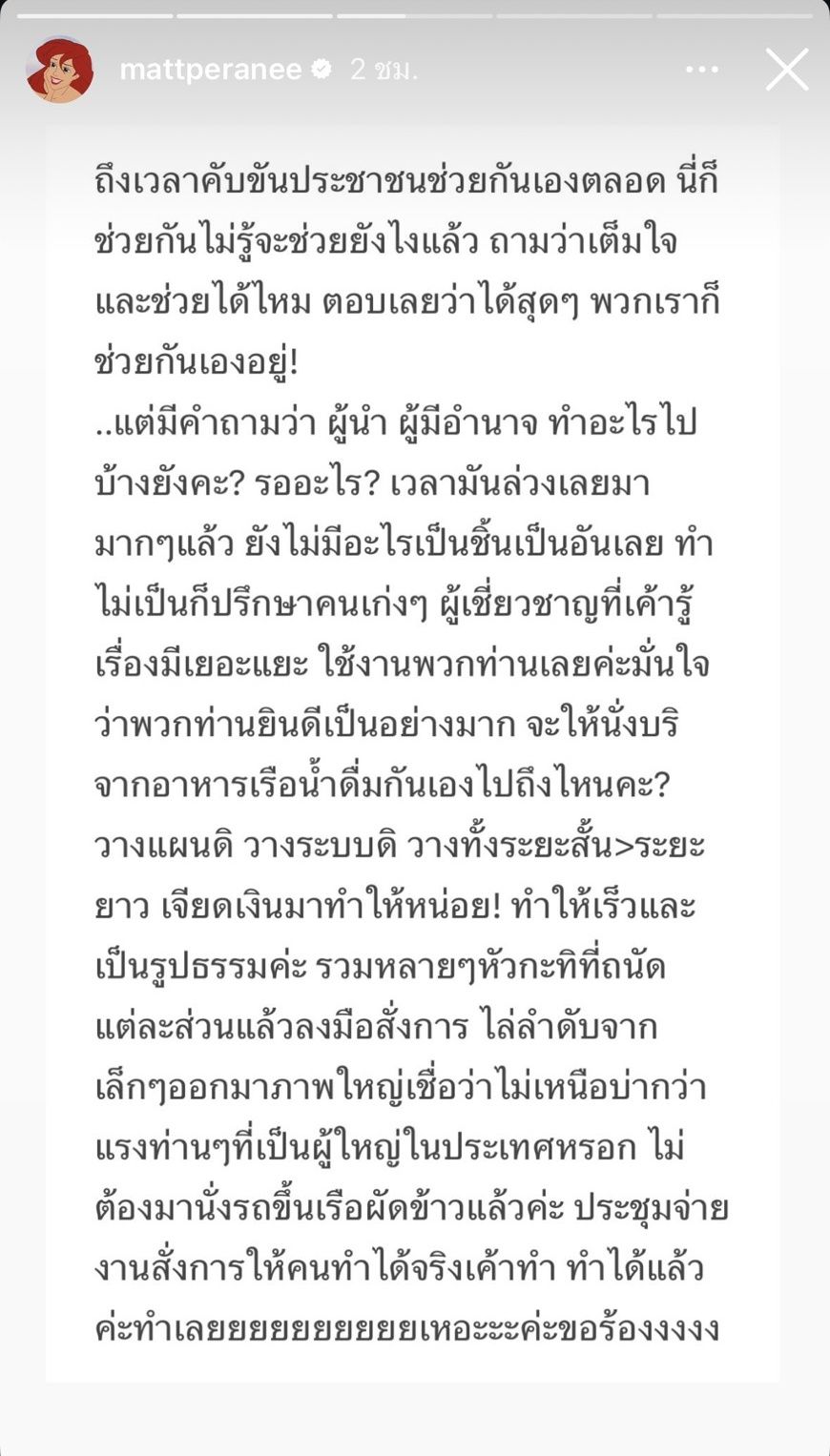 ล่าสุด แมท ภีรนีย์ ก็ได้ออกมาโพสต์ข้อความผ่านทางไอจีสตอรี่ พร้อมตั้งคำถามอย่างตรงไปตรงมาถึงท่านผู้นำและผู้ที่มีอำนาจ ว่าในสถานการณ์ตอนนี้จะสามารถทำอะไรเป็นชิ้นเป็นอันได้บ้าง เพราะในเวลาคับขัน ประชาชนช่วยเหลือกันเองตลอด ช่วยจนไม่รู้จะช่วยยังไงแล้ว พร้อมเสนอแนวทางการแก้ปัญหาที่ต้องการเห็น โดยเน้นย้ำถึงการใช้มืออาชีพในการวางแผนระยะยาวและการปฏิบัติการที่จริงจัง