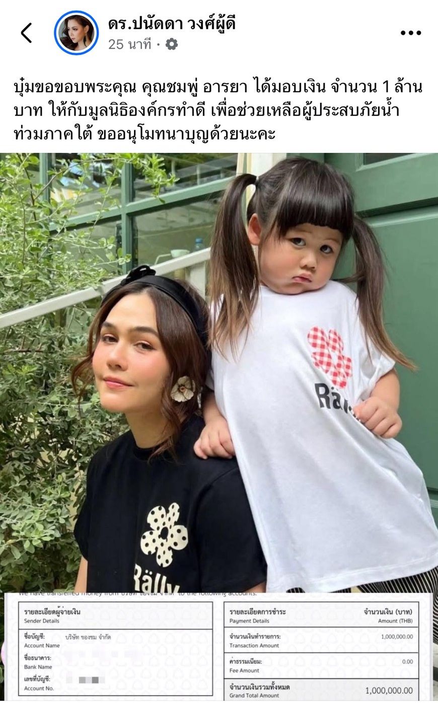 “บุ๋มขอขอบพระคุณ คุณชมพู่ อารยา ได้มอบเงิน จำนวน 1 ล้านบาท ให้กับมูลนิธิองค์กรทำดี เพื่อช่วยเหลือผู้ประสบภัยน้ำท่วมภาคใต้ ขออนุโมทนาบุญด้วยนะคะ”