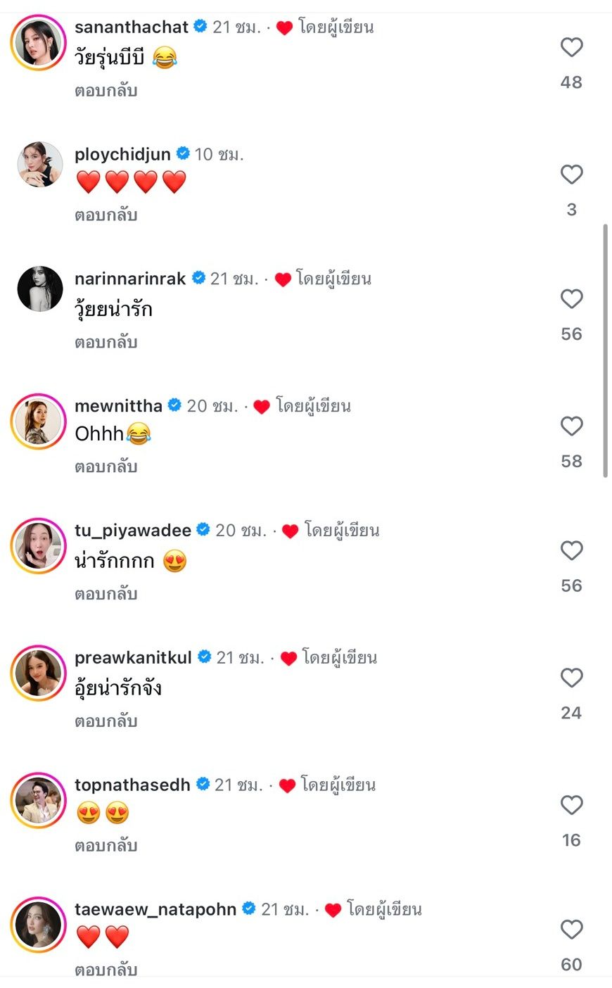 ในขณะที่คนในวงการก็เข้ามาแซวหลายคน อาทิ มุกดา นรินทร์รักษ์ “วุ้ยยน่ารัก”, ฝน ศนันธฉัตร “วัยรุ่นบีบี”, มิว นิษฐา “Ohhh”, ตู่ ปิยวดี “น่ารักกกก”, แพรว คณิตกุล “อุ้ยน่ารักจัง” แหวนแหวน ปวริศา “น่ารักไม่ไหวววว กรี๊ดดดดดดด ยุค bb ก็มา!!!” ฯลฯ