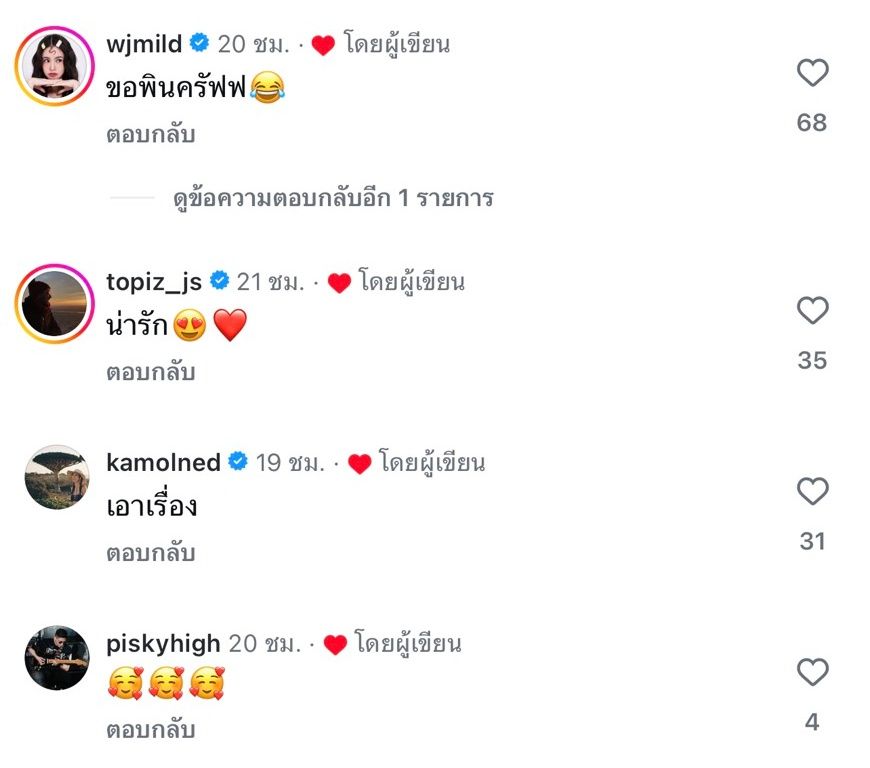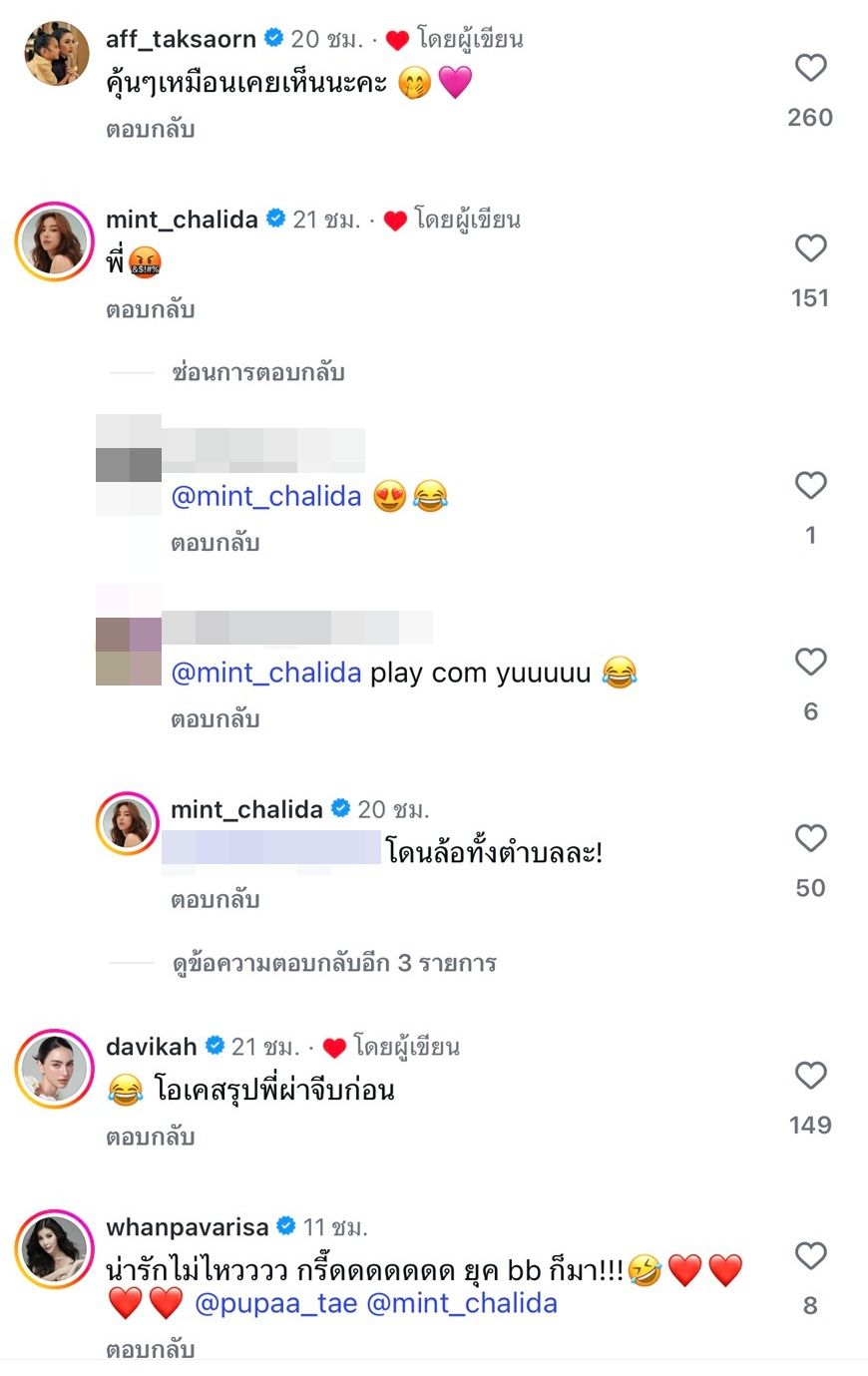 งานนี้ทำเอามิ้นต์ตอบกลับว่า “พี่ (อีโมจิหน้าโกรธและมีสัญลักษณ์ปิดปากสีดำ)” ก่อนที่จะมีเพื่อนเข้ามาแซวว่า “play com yuuuuu” และมิ้นต์ตอบกลับไปว่า “โดนล้อทั้งตำบลละ!” ในขณะที่ แอฟ ทักษอร ก็เข้ามาแซวว่า “คุ้นๆ เหมือนเคยเห็นนะคะ” ส่วน ใหม่ ดาวิกา เพื่อนซี้ของมิ้นต์ คอมเมนต์แซวว่า “โอเคสรุปพี่ผาจีบก่อน”