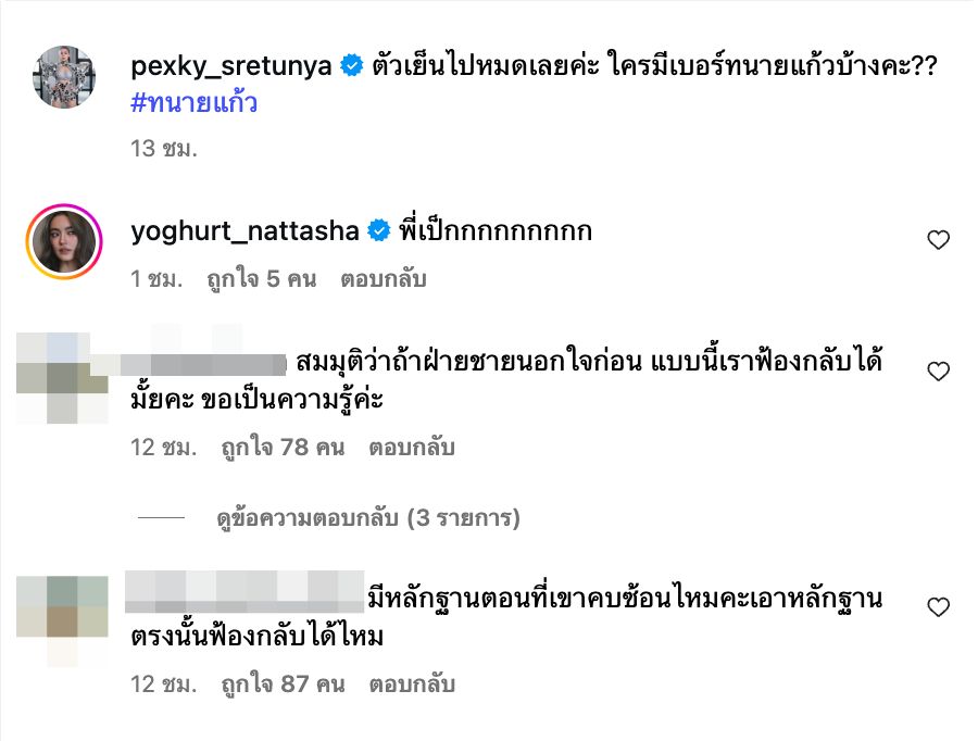 งานนี้ทำเอาเพื่อนพี่น้องในวงการบันเทิง รวมไปถึงแฟนๆ เข้ามาคอมเมนต์ว่า “มีหลักฐานตอนที่เขาคบซ้อนไหมคะเอาหลักฐานตรงนั้นฟ้องกลับได้ไหม, ช่องทางหาเงินเท่าที่คิดได้ตอนนี้สินะ, ห๊ะะะ งงมาก เป็นกำลังใจให้นะคะพี่เป็ก”