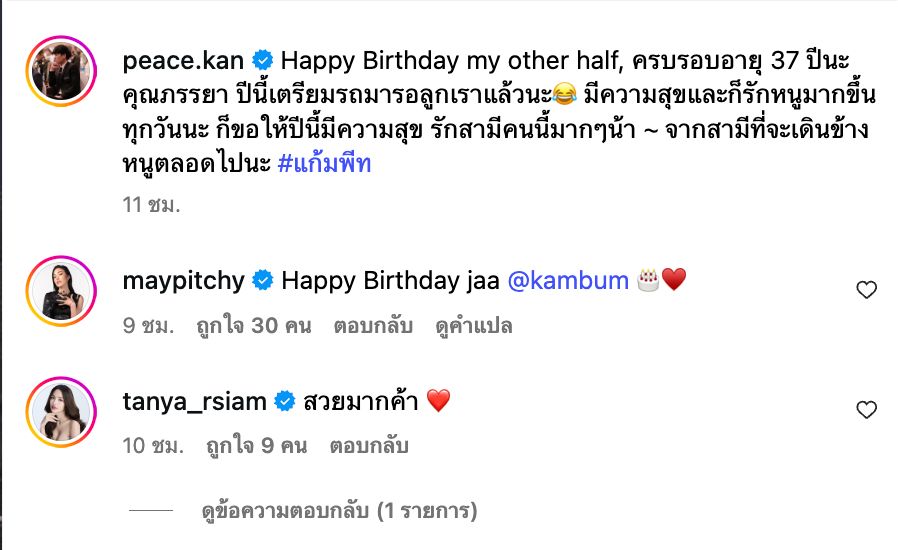 "Happy Birthday my other half, ครบรอบอายุ 37 ปีนะ คุณภรรยา ปีนี้เตรียมรถมารอลูกเราแล้วนะ มีความสุขและก็รักหนูมากขึ้นทุกวันนะ ก็ขอให้ปีนี้มีความสุข รักสามีคนนี้มากๆน้า ~ จากสามีที่จะเดินข้างหนูตลอดไปนะ #แก้มพีท"