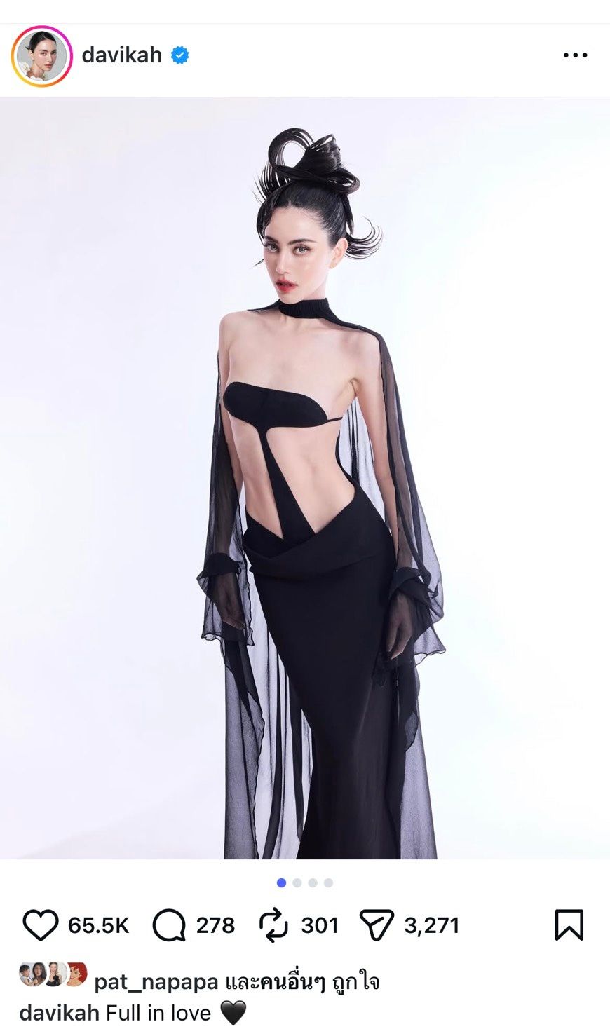 แต่ที่ดูเหมือนจะทำเอาชาวเน็ตสนใจมากกว่าแคปชั่นก็คือ ชุดที่ดาวิใส่นั่นเอง เพราะลุคนี้ ใหม่ มาในชุดสีดำ แบบมินิมอลสุดๆ แต่ความแซ่บนั้นเกินต้านจริงๆ ที่ท่อนบนมีเพียงผ้าคาดอกเส้นจิ๋ว ส่วนท่อนล่างเป็นกระโปรงยาวผ้าโปร่งพริ้วไหว ซึ่งชุดนี้เผยให้เห็นผิวขาวๆ ของใหม่ ดาวิกา เกือบทั้งตัว รวมๆ ดูแล้วทั้งสวย เซ็กซี่ เรียบหรู มีเสน่ห์มากๆ