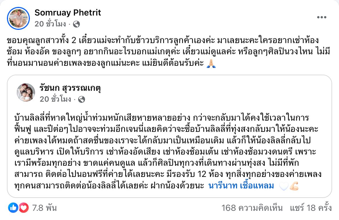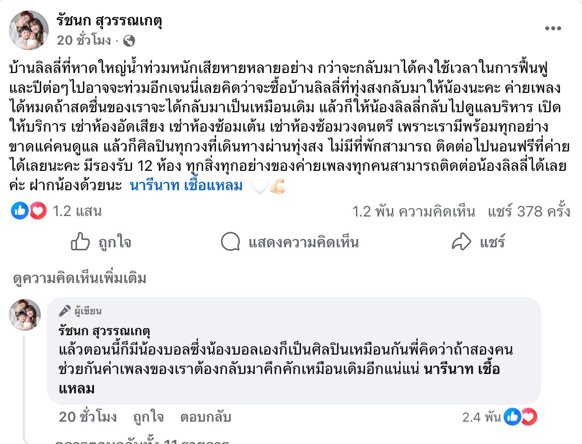 “บ้านลิลลี่ที่หาดใหญ่น้ำท่วมหนักเสียหายหลายอย่าง กว่าจะกลับมาได้คงใช้เวลาในการฟื้นฟู และปีต่อๆไปอาจจะท่วมอีกเจนนี่เลยคิดว่าจะซื้อบ้านลิลลี่ที่ทุ่งสงกลับมาให้น้องนะคะ ค่ายเพลงได้หมดถ้าสดชื่นของเราจะได้กลับมาเป็นเหมือนเดิม แล้วก็ให้น้องลิลลี่กลับไปดูแลบริหาร เปิดให้บริการ เช่าห้องอัดเสียง เช่าห้องซ้อมเต้น เช่าห้องซ้อมวงดนตรี เพราะเรามีพร้อมทุกอย่าง ขาดแค่คนดูแล แล้วก็ศิลปินทุกวงที่เดินทางผ่านทุ่งสง ไม่มีที่พักสามารถ ติดต่อไปนอนฟรีที่ค่ายได้เลยนะคะ มีรองรับ 12 ห้อง ทุกสิ่งทุกอย่างของค่ายเพลงทุกคนสามารถติดต่อน้องลิลลี่ได้เลยค่ะ ฝากน้องด้วยนะ นารีนาท เชื้อแหลม ”