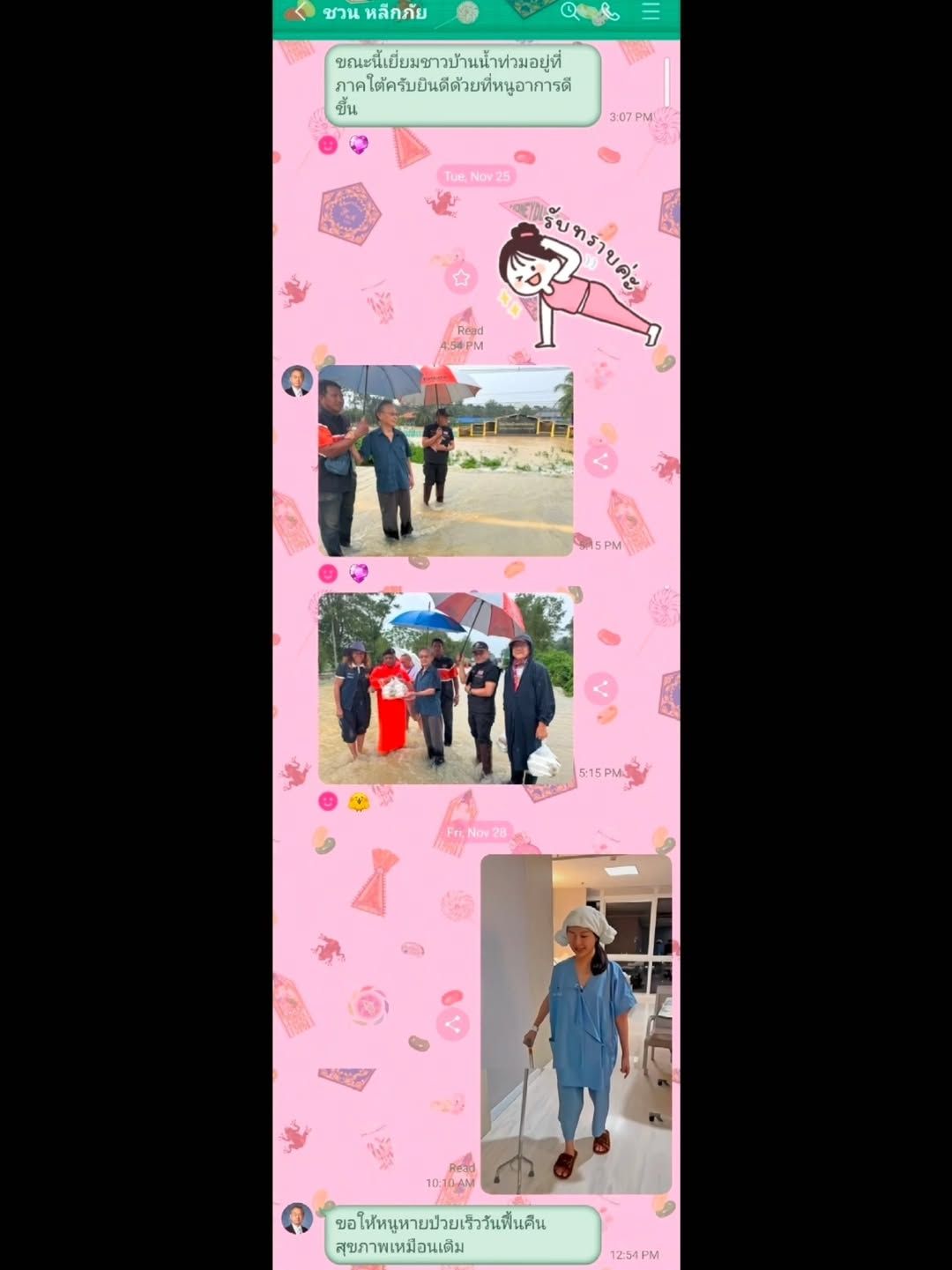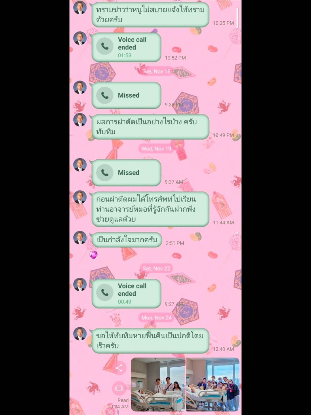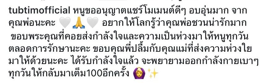 ซึ่งเจ้าตัวได้แชร์โมเมนต์ดังกล่าว พร้อมเขียนแคปชั่นว่า “หนูขออนุญาตแชร์โมเมนต์ดีๆ อบอุ่นมาก จากคุณพ่อนะคะ อยากให้โลกรู้ว่าคุณพ่อชวนน่ารักมาก ขอบพระคุณที่คอยส่งกำลังใจและความเป็นห่วงมาให้หนูทุกวันตลอดการรักษานะคะ ขอบคุณพี่ปลื้มกับคุณแม่ที่ส่งความห่วงใยมาให้ด้วยนะคะ ได้รับกำลังใจแล้ว จะพยายามออกกำลังกายเบาๆ ทุกวันให้กลับมาเต็ม 100 อีกครั้ง”