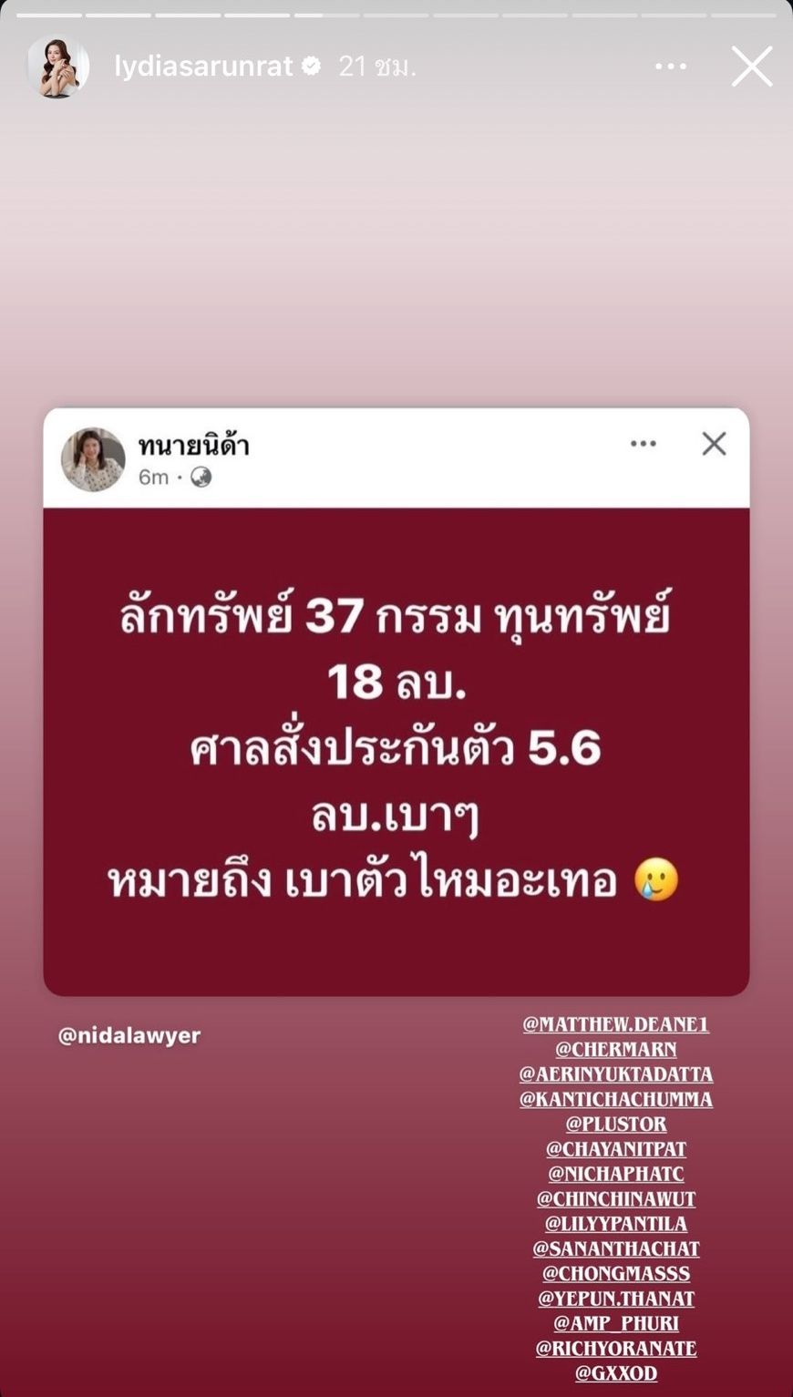 ล่าสุด ลีเดีย ก็ได้ออกมาแชร์ข้อความของ ทนายนิด้า ผ่านไอจีสตอรี่ พร้อมกับแท็กเพื่อนดาราที่เคยมีผู้จัดการคนเดียวกัน ซึ่งข้อความที่ ทนายนิด้า เขียนนั้นได้ระบุว่า “ลักทรัพย์ 37 กรรม ทุนทรัพย์ 18 ลบ. ศาลสั่งประกันตัว 5.6 ลบ.เบาๆ หมายถึง เบาตัวไหมอะเทอ”