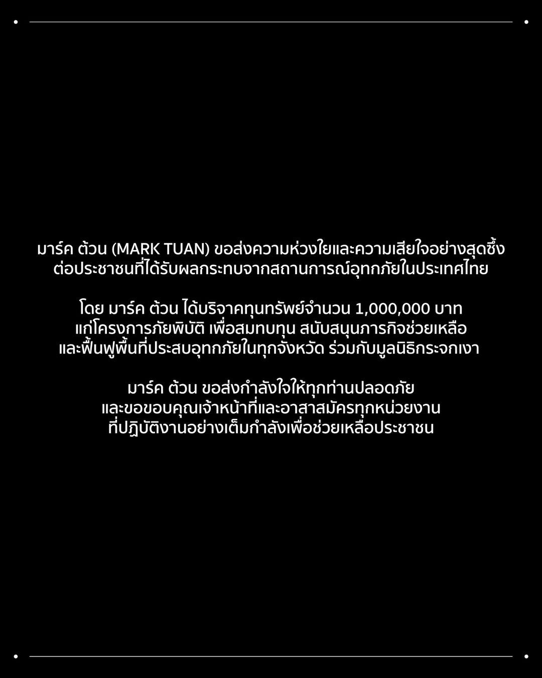 "มาร์ค ต้วน (MARK TUAN) ขอส่งความห่วงใยและความเสียใจอย่างสุดซึ้งต่อประชาชนที่ได้รับผลกระทบจากสถานการณ์อุทกภัยในประเทศไทย