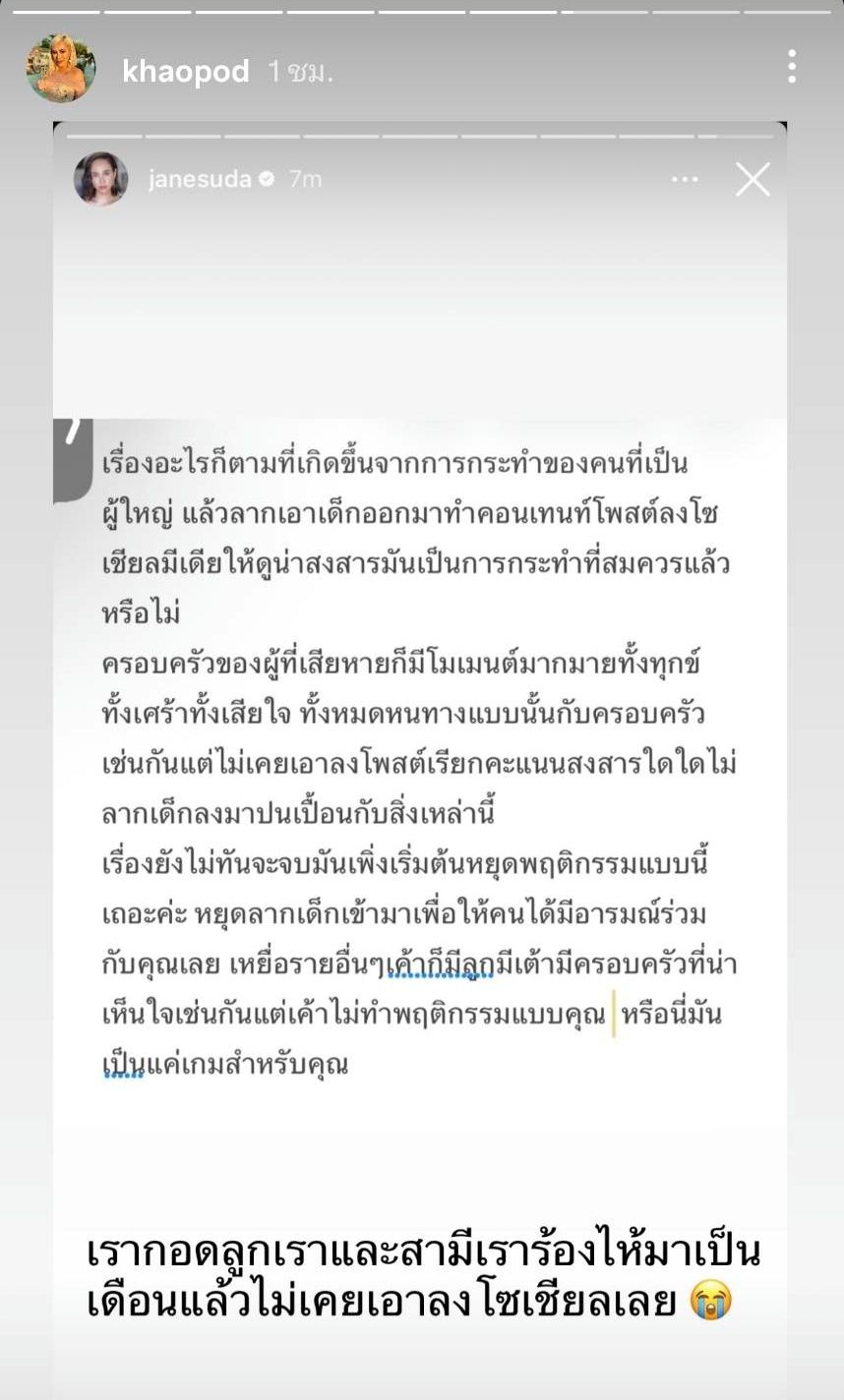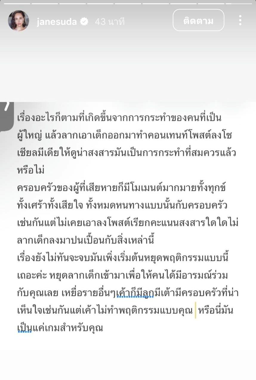หลังจากที่นักร้องนักแสดงสาว เจนสุดา ปานโต โพสต์ข้อความแซ่บลงในไอจีสตอรี่ว่า “เรื่องอะไรก็ตามที่เกิดขึ้นจากการกระทําของคนที่เป็นผู้ใหญ่ แล้วลากเอาเด็กออกมาทําคอนเทนต์โพสต์ลงโซเชียลมีเดียให้ดูน่าสงสารมันเป็นการกระทําที่สมควรแล้วหรือไม่ ครอบครัวของผู้ที่เสียหายก็มีโมเมนต์มากมายทั้งทุกข์ ทั้งเศร้าทั้งเสียใจ ทั้งหมดหนทางแบบนั้นกับครอบครัวเช่นกัน แต่ไม่เคยเอาลงโพสต์เรียกคะแนนสงสารใดใด ไม่ลากเด็กลงมาปนเปื้อนกับสิ่งเหล่านี้