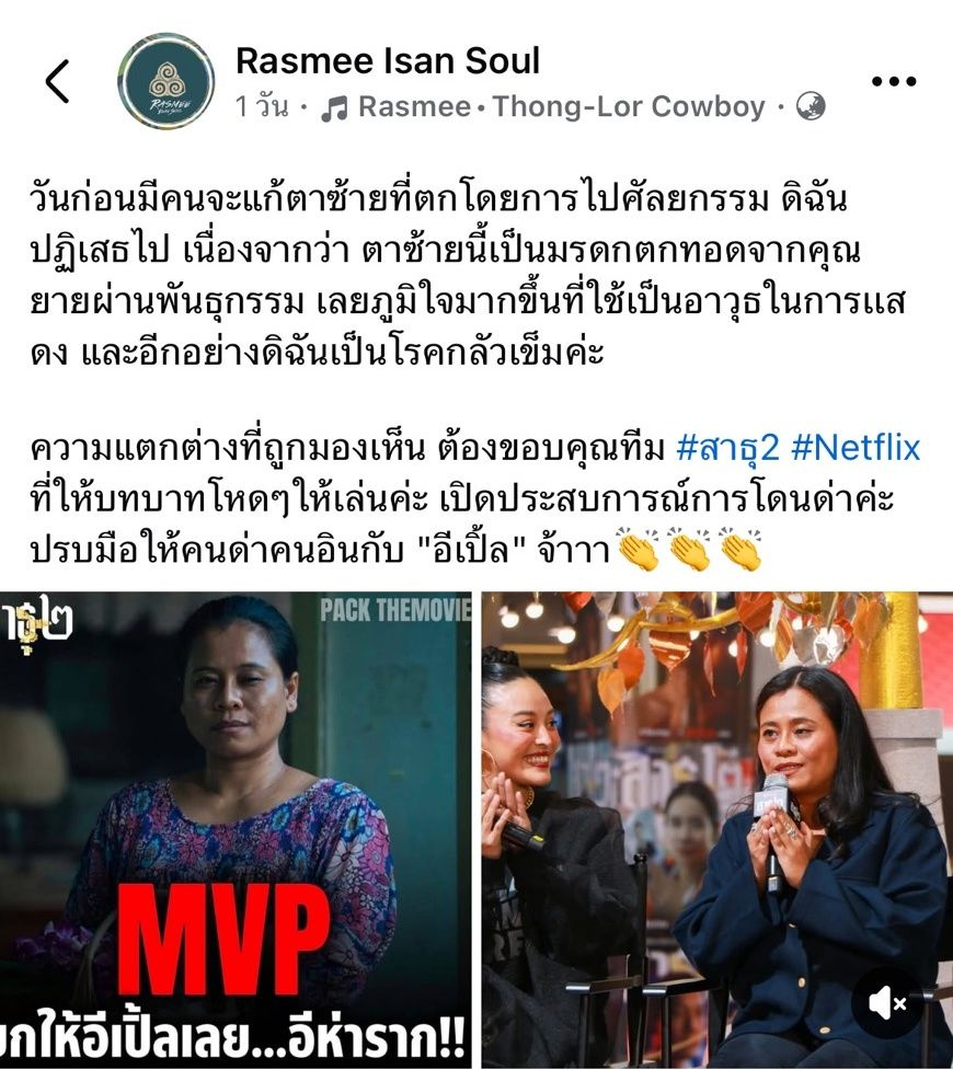 ต้องยอมรับฝีมือการแสดงของ แป้ง รัสมี เวระนะ หรือ Rasmee Isan Soul ศิลปินแนวโซลที่นำดนตรีอีสานมาผสมในเพลง ที่ได้มารับบท "เปิ้ล" ในซีรีส์เรื่อง "สาธุ 2" ทาง Netflix กำลังถูกเป็นที่พูดถึงอย่างมาก ด้วยคาแรกเตอร์และบุคลิกในเรื่องที่ดูแล้วชวนขนลุกมากทีเดียว