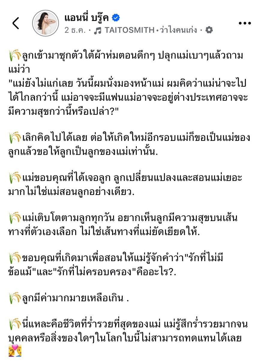 เป็นคู่แม่ลูกที่ดูแลกันเป็นอย่างดี และลูกชายก็เป็นเด็กดีมาก จนหลายคนชื่นชมในความกตัญญูของหนุ่มน้อย สำหรับ น้องฑีฆายุ ลูกชายสุดรักสุดหวงของ คุณแม่แอนนี่ บรู๊ค ล่าสุด แม่แอนนี่ ก็ได้แชร์โมเมนต์น่ารักๆ ของลูกชาย ที่มาซุกตัวใต้ผ้าห่ม แล้วถามแม่ว่า แม่ยังไม่แก่เลย ทำไมไม่หาแฟน ซึ่ง แอนนี่ ก็ได้ตอบลูกชายว่า ให้เลิกคิดไปได้เลย ลูกคือบุคคลที่ไม่สามารถทดแทนได้ ขอบคุณที่เกิดมาเพื่อสอนให้แม่รู้จักคำว่า รักที่ไม่มีข้อแม้คืออะไร