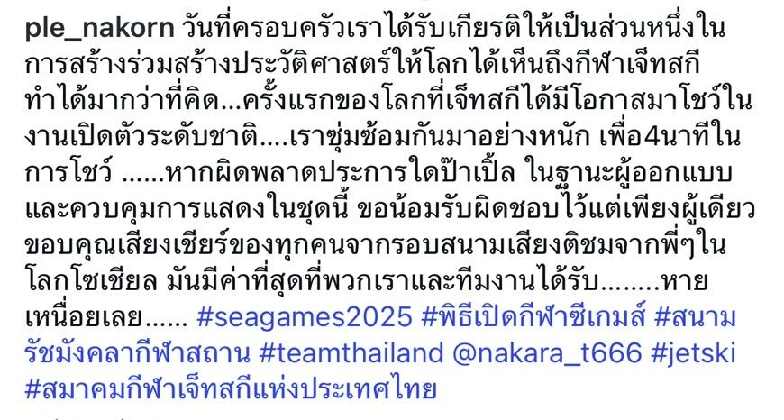 หากผิดพลาดประการใด ป๊าเปิ้ลในฐานะผู้ออกแบบและควบคุมการแสดงในชุดนี้ ขอน้อมรับผิดชอบไว้แต่เพียงผู้เดียว ขอบคุณเสียงเชียร์ของทุกคนจากรอบสนามเสียงติชมจากพี่ๆ ในโลกโซเชียล มันมีค่าที่สุดที่พวกเราและทีมงานได้รับ หายเหนื่อยเลย #seagames2025 #พิธีเปิดกีฬาซีเกมส์ #สนามรัชมังคลากีฬาสถาน #teamthailand @nakara_t666 #jetski #สมาคมกีฬาเจ็ตสกีแห่งประเทศไทย"