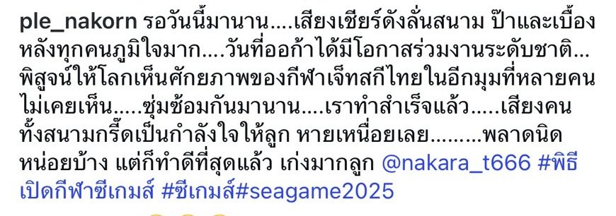 "รอวันนี้มานาน เสียงเชียร์ดังลั่นสนาม ป๊าและเบื้องหลังทุกคนภูมิใจมาก วันที่ออก้าได้มีโอกาสร่วมงานระดับชาติ พิสูจน์ให้โลกเห็นศักยภาพของกีฬาเจ็ตสกีไทยในอีกมุมที่หลายคนไม่เคยเห็น ซุ่มซ้อมกันมานาน เราทำสำเร็จแล้ว เสียงคนทั้งสนามกรี๊ดเป็นกำลังใจให้ลูก หายเหนื่อยเลย พลาดนิดหน่อยบ้าง แต่ก็ทำดีที่สุดแล้ว เก่งมากลูก @nakara_t666 #พิธีเปิดกีฬาซีเกมส์ #ซีเกมส์#seagame2025"