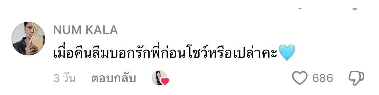 โดย หนุ่ม กะลา ได้เข้ามาคอมเมนต์ในคลิปดังกล่าวทำเอาคนโสดแทบอยากจะกัดลิ้นตัวเองตายว่า "เมื่อคืนลืมบอกรักพี่ก่อนโชว์หรือเปล่าคะ" พร้อมอีโมจิหัวใจสีฟ้า ซึ่งจ๊ะโอ๋ก็ได้เข้ามากดไลก์ในคอมเมนต์ของหวานใจด้วยเช่นกัน เรียกว่าคู่นี้เขาหวานจนน้ำตาลยังยอมแพ้เลยทีเดียว