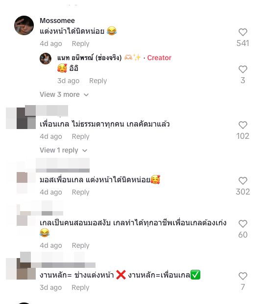 โดย แนท อนิพรณ์ และ น้ำตาล ชลิตา ได้คอนเฟิร์มผ่านคลิปว่า มอสเพื่อนเกลคือช่างแต่งหน้าฝีมือเยี่ยมระดับตัวแม่ที่หลายคนต้องการตัว ซึ่ง 2 สาวสวยมีมงได้การันตีว่ามอสเพื่อนเกลแต่งหน้าสวยจึ้ง งานละเอียดแบบสุดๆ แต่งานนี้มอสเพื่อนเกลขอถ่อมตัวนิดนึง ด้วยการเข้ามาคอมเมนต์ว่า "แต่งหน้าได้นิดหน่อย"
