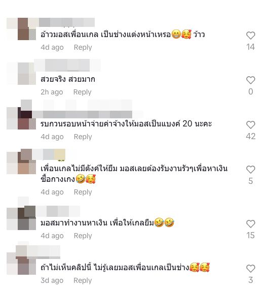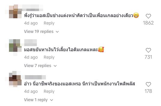 หลังจากที่คลิปดังกล่าวถูกเผยแพร่ไป ก็ทำเอาชาวเน็ตหลายคนถึงอึ้งเมื่อได้รู้ว่ามอสนั้นมีอาชีพเป็นช่างแต่งหน้า ต่างเข้ามาคอมเมนต์กันว่า "อ้าวมอสเพื่อนเกล เป็นช่างแต่งหน้าเหรอ ว้าว, ถ้าไม่เห็นคลิปนี้ ไม่รู้เลยมอสเพื่อนเกลเป็นช่าง, อ้าว นี่อาชีพจริงของมอสเหรอ นึกว่าเป็นพนักงานโพลิพลัส, เพิ่งรู้ว่ามอสเป็นช่างแต่งหน้าคิดว่าเป็นเพื่อนเกลอย่างเดียว, เพิ่งทราบๆ จริงๆ ค่ะ ถึงว่าแต่งสวยมากก, เพื่อนเกลคืองานหลัก แต่งหน้าคืองานสำรอง, ชั้นนึกว่ามอสทำงานเป็นพี่้เลี้ยงเกล ช่วยป้าเจี๊ยบ, เพิ่งรู้ว่ามอสเป็นช่างแต่งหน้า"