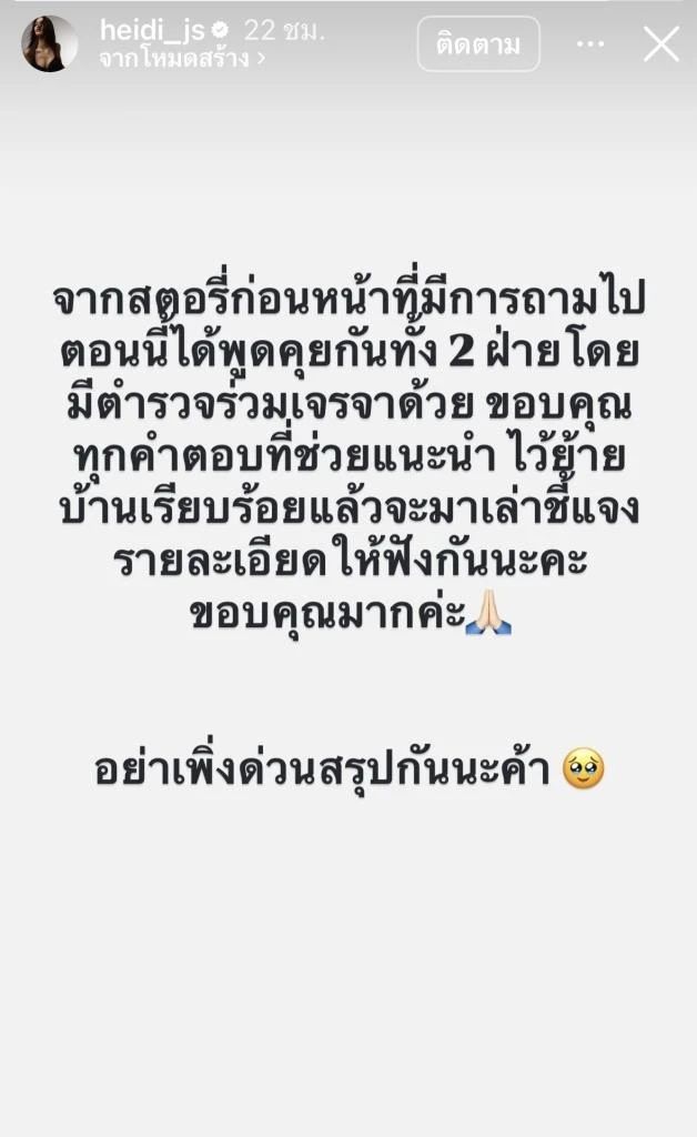 และล่าสุดไฮดี้ก็ได้โพสต์ชี้แจงอีกครั้งผ่านทางไอจีสตอรี่ โดยบอกว่าได้เจรจากับเพื่อนข้างบ้านแล้ว โดยมีตำรวจมาร่วมเจรจาด้วย และเตรียมจะย้ายออกจากบ้านหลังนี้ โดยบอกว่า “จากสตอรี่ก่อนหน้าที่มีการถามไป ตอนนี้ได้พูดคุยกันทั้ง 2 ฝ่าย โดยมีตำรวจร่วมเจรจาด้วย ขอบคุณทุกคำตอบที่ช่วยแนะนำ ไว้ย้ายบ้านเรียบร้อยแล้วจะมาเล่าชี้แจงรายละเอียดให้ฟังกันนะคะ ขอบคุณมากค่ะ อย่าเพิ่งด่วนสรุปกันนะค้า”