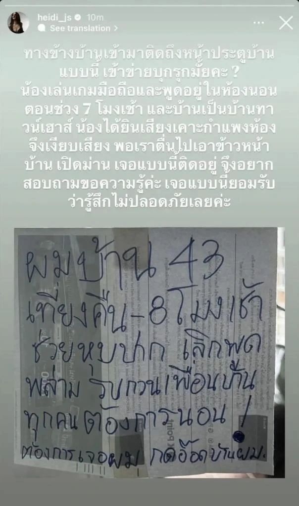ซึ่งไฮดี้ก็ได้เขียนข้อความว่า “ทางข้างบ้านเข้ามาติดถึงหน้าประตูบ้านแบบนี้ เข้าข่ายบุกรุกมั้ยคะ? น้องเล่นเกมมือถือและพูดอยู่ในห้องนอน ตอนช่วง 7 โมงเช้า และบ้านเป็นบ้านทาวน์เฮาส์ น้องได้ยินเสียงเคาะกำแพงห้อง จึงเงียบเสียง พอเราตื่นไปเอาข้าวหน้าบ้าน เปิดม่าน เจอแบบนี้ติดอยู่ จึงอยากสอบถาม ขอความรู้ค่ะ เจอแบบนี้ยอมรับว่ารู้สึกไม่ปลอดภัยเลยค่ะ”