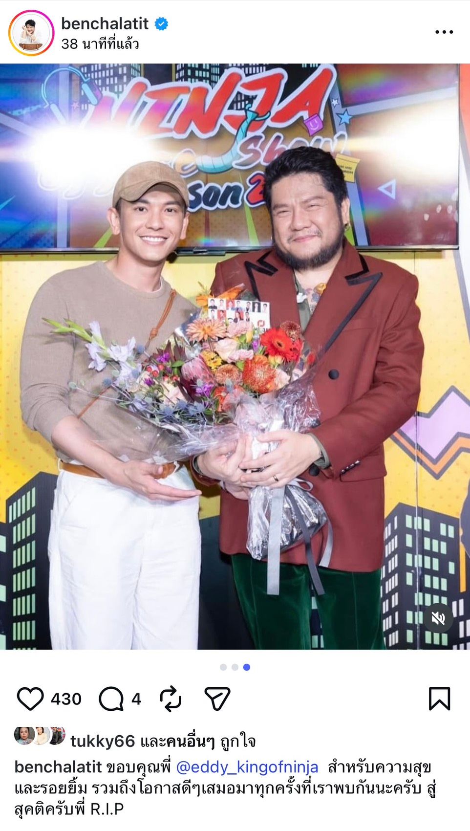 - เบน ชลาทิศ โพสต์รูปและแคปชันว่า "ขอบคุณพี่ @eddy_kingofninja สำหรับความสุขและรอยยิ้ม รวมถึงโอกาสดีๆเสมอมาทุกครั้งที่เราพบกันนะครับ สู่สุคติครับพี่ R.I.P"