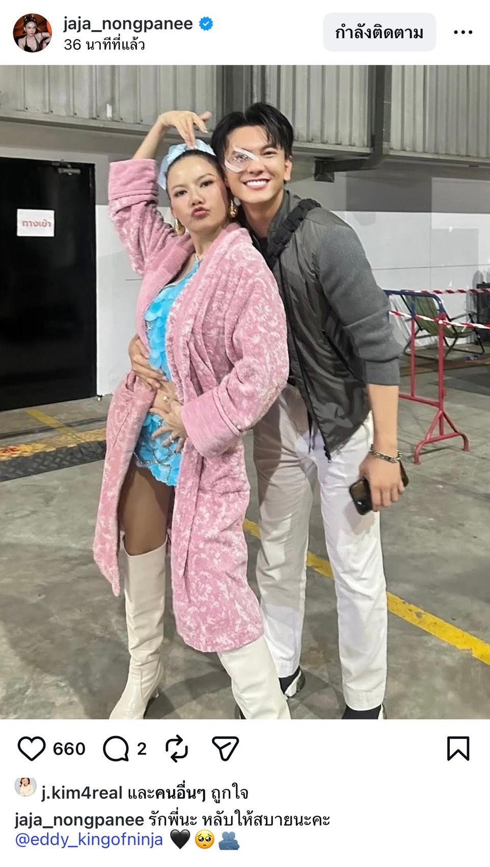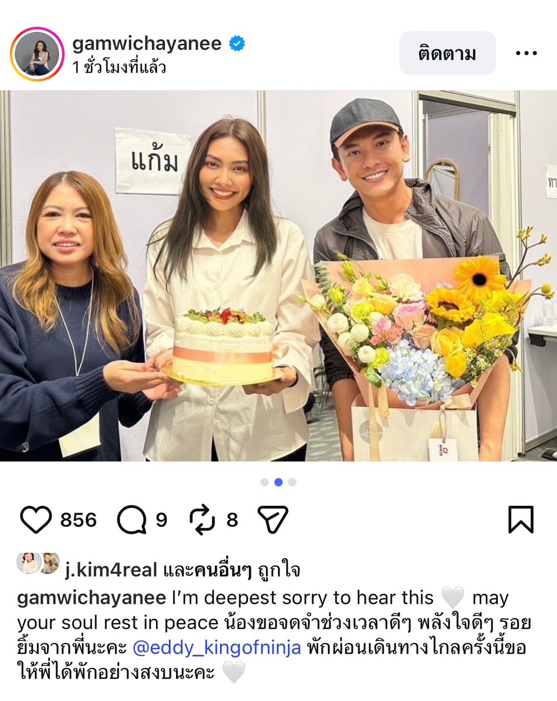 - แก้ม วิชญาณี ก็โพสต์รูปและแคปชันว่า "I’m deepest sorry to hear this may your soul rest in peace น้องขอจดจำช่วงเวลาดีๆ พลังใจดีๆ รอยยิ้มจากพี่นะคะ @eddy_kingofninja พักผ่อนเดินทางไกลครั้งนี้ขอให้พี่ได้พักอย่างสงบนะคะ"