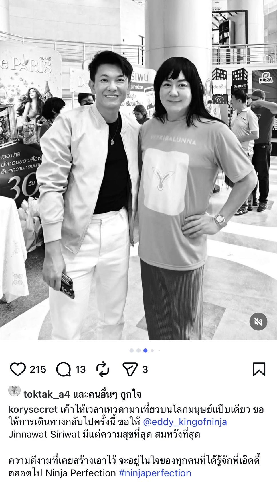 - โก้ ธีรศักดิ์ โพสต์ อินสตาแกรมและแคปชันว่า "เค้าให้เวลาเทวดามาเที่ยวบนโลกมนุษย์แป๊บเดียว ขอให้การเดินทางกลับไปครั้งนี้ ขอให้ @eddy_kingofninja Jinnawat Siriwat มีแต่ความสุขที่สุด สมหวังที่สุด ความดีงามที่เคยสร้างเอาไว้ จะอยู่ในใจของทุกคนที่ได้รู้จักพี่เอ็ดดี้ตลอดไป Ninja Perfection #ninjaperfection"
